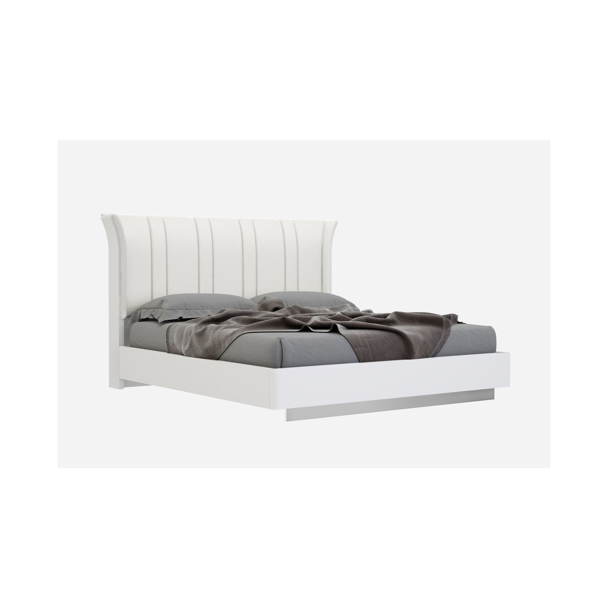 Ariana Bedroom Set, the artistic lounge. Ariana has a beautiful smoky essence with swirls of gray and white, surrounding you with relaxation. The set comes in king or queen bed with an eco-leather upholstered headboard, two nightstands, a mirror, and a unique-style dresser. Everything has a beautiful high-gloss finish with stainless steel accents.