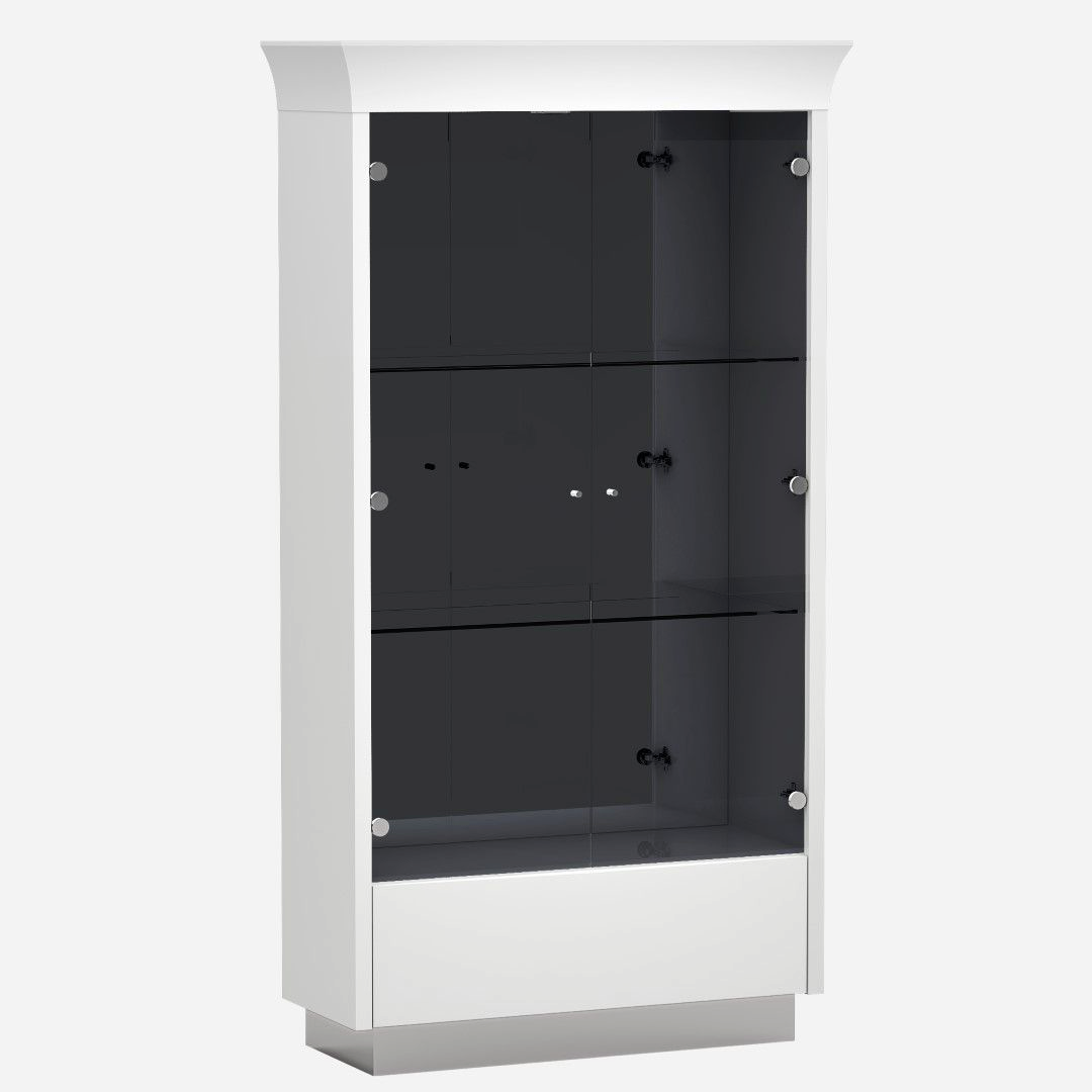 - Material: Lacquered Veneer, MDF, Stainless Steel accents