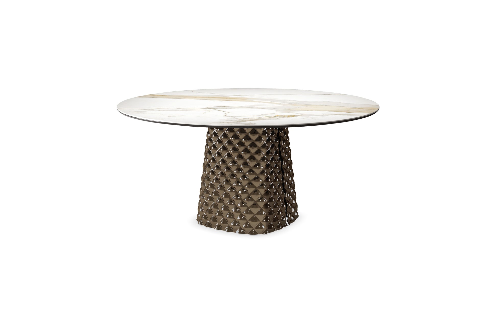 The Atrium Keramik Round Table is a masterpiece made in Italy that will elevate your dining experience. With its stunning mirrored quilted fume or bronze curved glass base, this table is a true work of art. The top comes in your choice of 10 exquisite finishes, allowing you to customize it to perfectly match your style and decor. Create a luxurious and inviting atmosphere in your home with the Atrium Keramik Round Table.