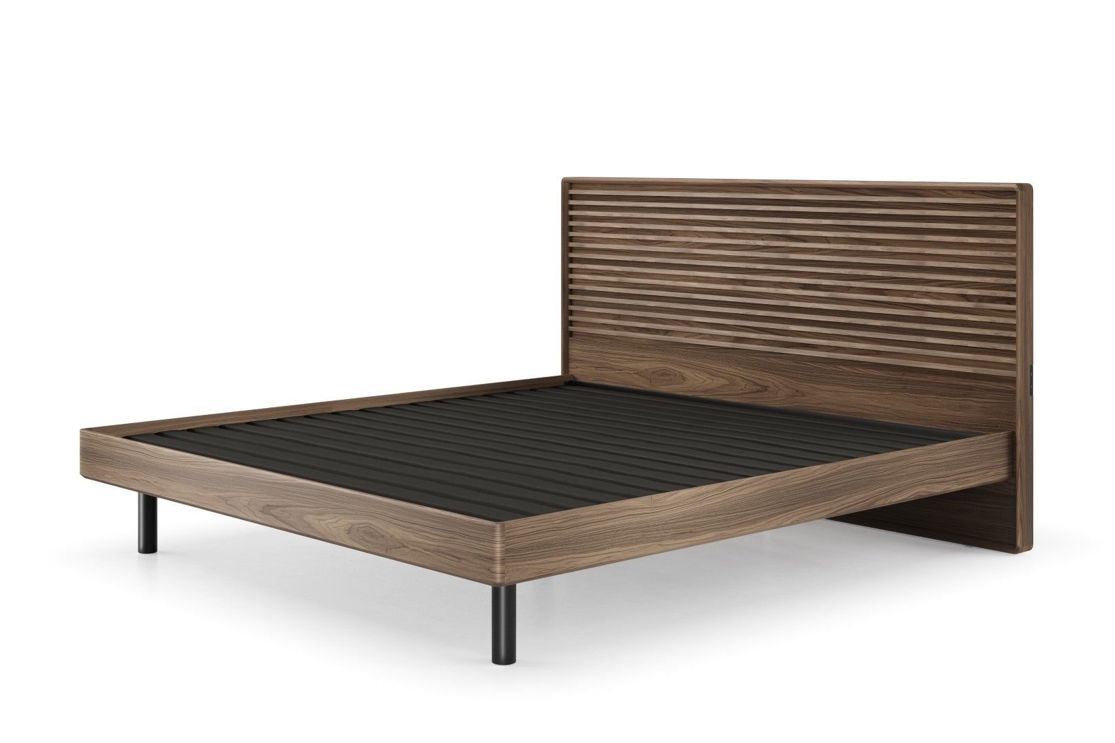 The dramatic cross-linq bed has a sleek, slanted headboard that complements the bed's slightly curved shape. It also has a charging station on each side of the bed.