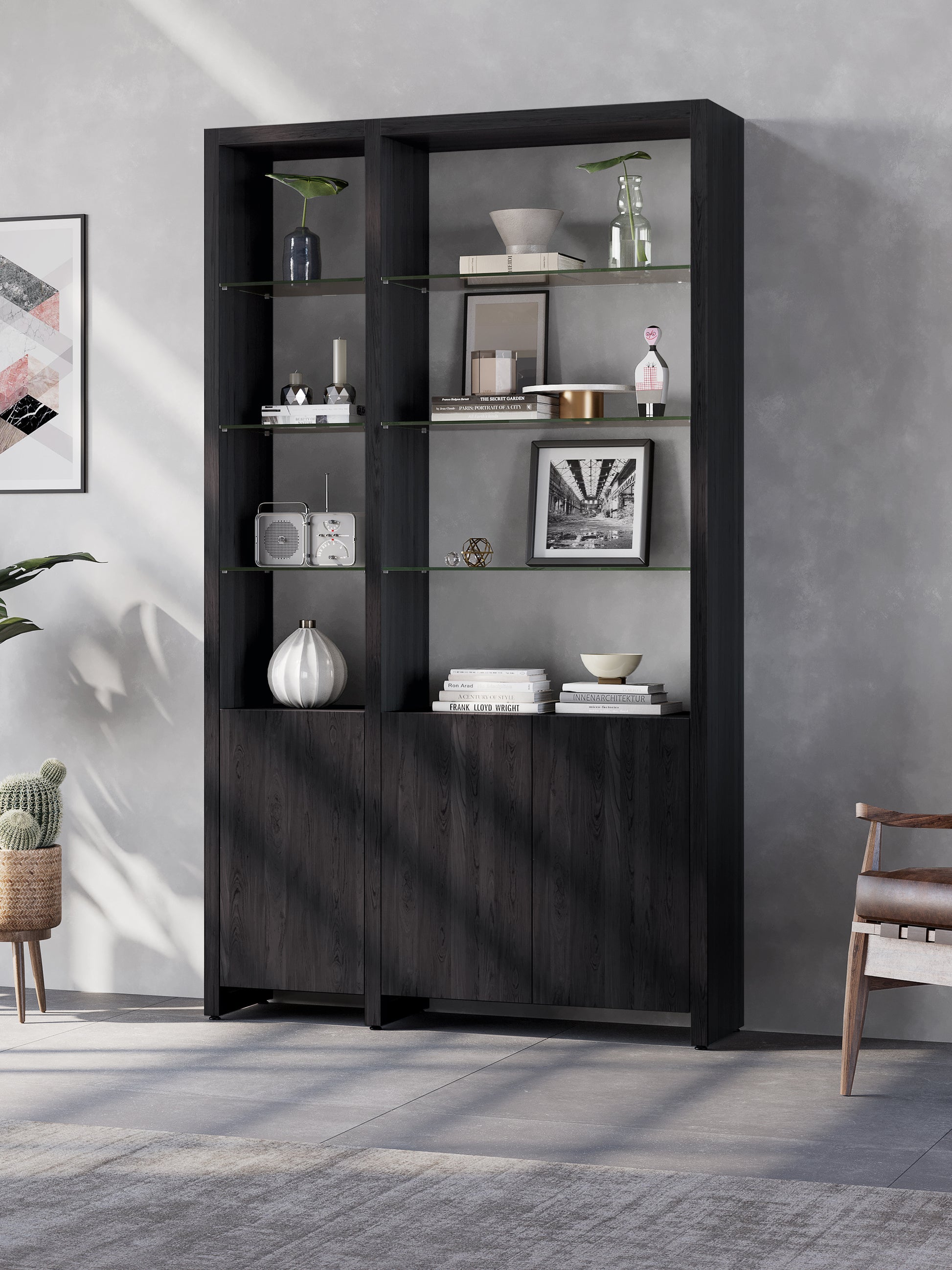 - Tempered glass shelves for a light, modern aesthetic
