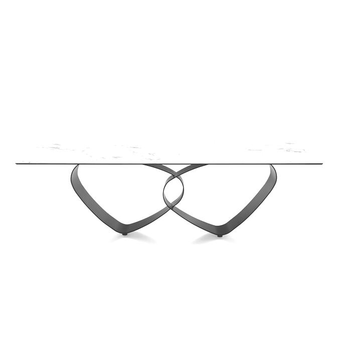 Breeze is a stunning non-extending table with a top made of either plate glass or ceramic, stylishly supported by a curved sheet-metal base. Turi Simeti's "ellipses" serve as inspiration for this design, which creates a magnificent display of geometrics and optical illusion. The table's two-dimensional pieces appear to weave in and out of one another, creating a complicated and captivating interlocking pattern. This design also expertly manipulates the interplay of light, producing a dynamic and changeable visual impact as it interacts with the table's monochromatic surface.