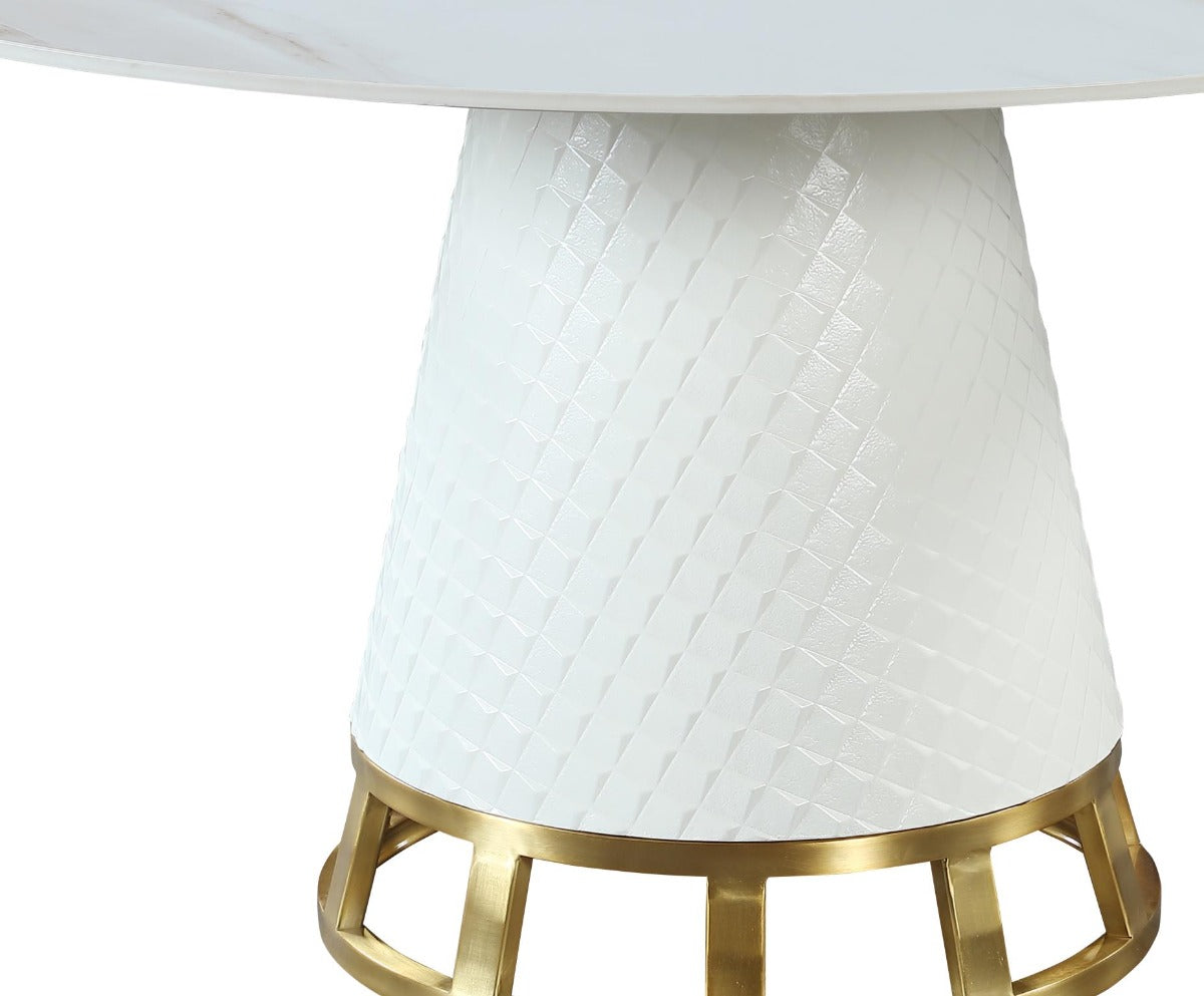 Upgrade your dining space with the Chintaly Khloe Dining Set, featuring a sintered stone tabletop, a wooden cone base with a raised diamond pattern, and a brushed gold accent for a touch of luxury. The club-style armchairs with memory swivel offer both comfort and style. Shop now at Creative Furniture Store for modern elegance!