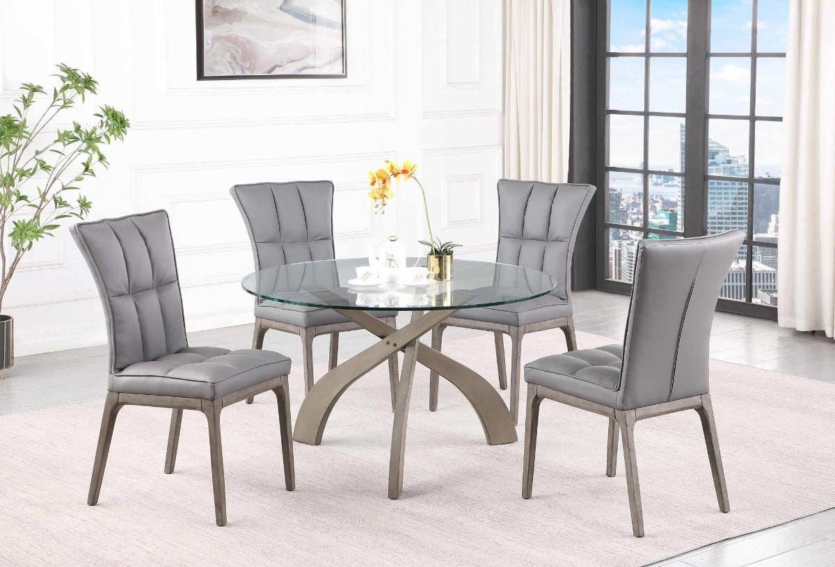 Bring contemporary charm to your dining space with the Chintaly Peggy Round Glass Top Dining Table, available at Creative Furniture Store. Featuring a 47-inch round clear tempered glass top, this table offers a sleek and open feel. The crisscross solid wood base provides stability while adding a bold, sculptural touch. Finished in a stylish gray veneer, it effortlessly blends modern design with timeless sophistication.