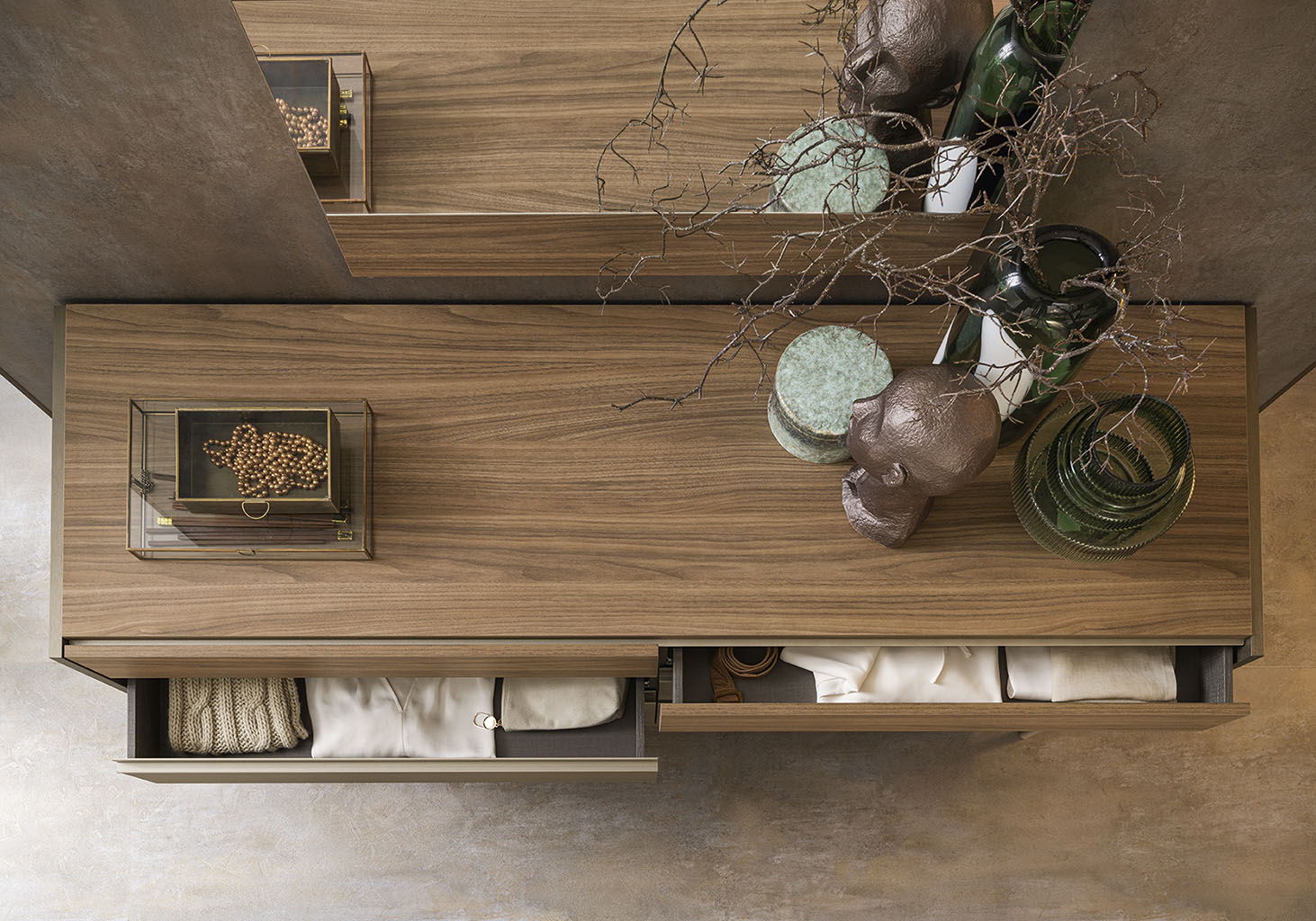 For a unified look, the ecological wood finish flows seamlessly from the tops into the drawer fronts. Subtle groove-profile openings replace traditional handles, blending effortlessly into the clean, modern lines of the collection.