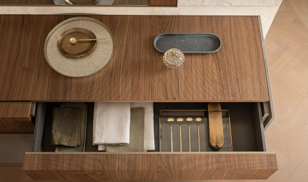 - Finish: Brushed Beige High Gloss, Walnut Fluted