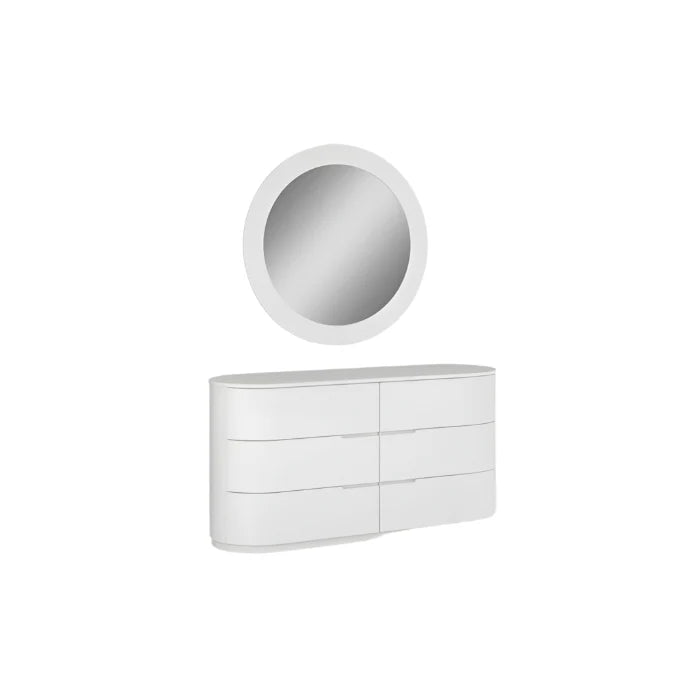 The Moonlight captures the essence of minimalism, yet with touches of elegance not yet seen until now. A shiny, high-gloss lacquer finish over a light grey smooth design encompasses what seems like a floating king or queen bed set. A bendable LED light adds functionality, while a single stainless steel dash adds an elegant separation to the headboard. Wonderfully smooth oval nightstands and a curvaceous dresser and chest are complete with a complimentary round mirror that truly lends itself to the Moonlight name.