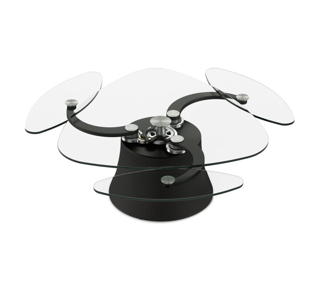A clear, tempered glass main top is complemented by three rotating glass wings, adding layers of visual depth and movement. The transparency of the glass enhances the table’s modern, airy aesthetic while allowing a glimpse of the intricate mechanical details beneath.