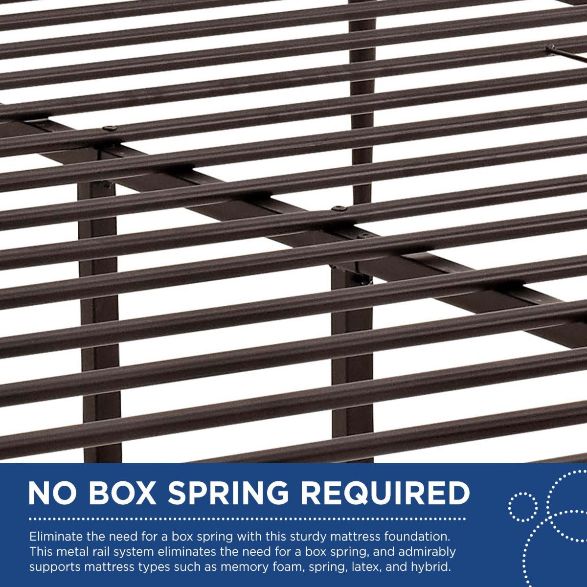 Experience serene sleep with the Annika Platform Bed. Introduce a relaxed country look made of coated steel, tapered dowel steel legs with non-marking foot caps, metal slat supports, and a reinforced center beam with legs for maximal stability. A charming addition to your modern farmhouse or cottage décor, Annika’s rail system eliminates the need for a box spring, and admirably supports mattress types such as memory foam, spring, latex, and hybrid. Weight capacity up to 1300 lbs. Mattress Not Included.