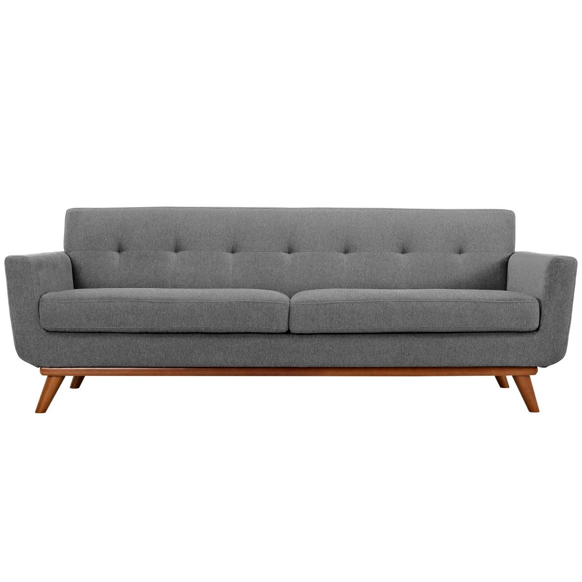 Gently sloping curves and large dual cushions create a favorite lounging spot. Whether plopping down after a long day at work, settling in with coffee and brunch, or entering a spirited discussion with friends, the Engage sofa is a welcome presence in your home. Seven tufted buttons create eye-catching appeal, adding depth that brings your sitting décor to center stage. Four cherry color rubberwood legs and frame supply a solid base to the comfortable upholstered material.