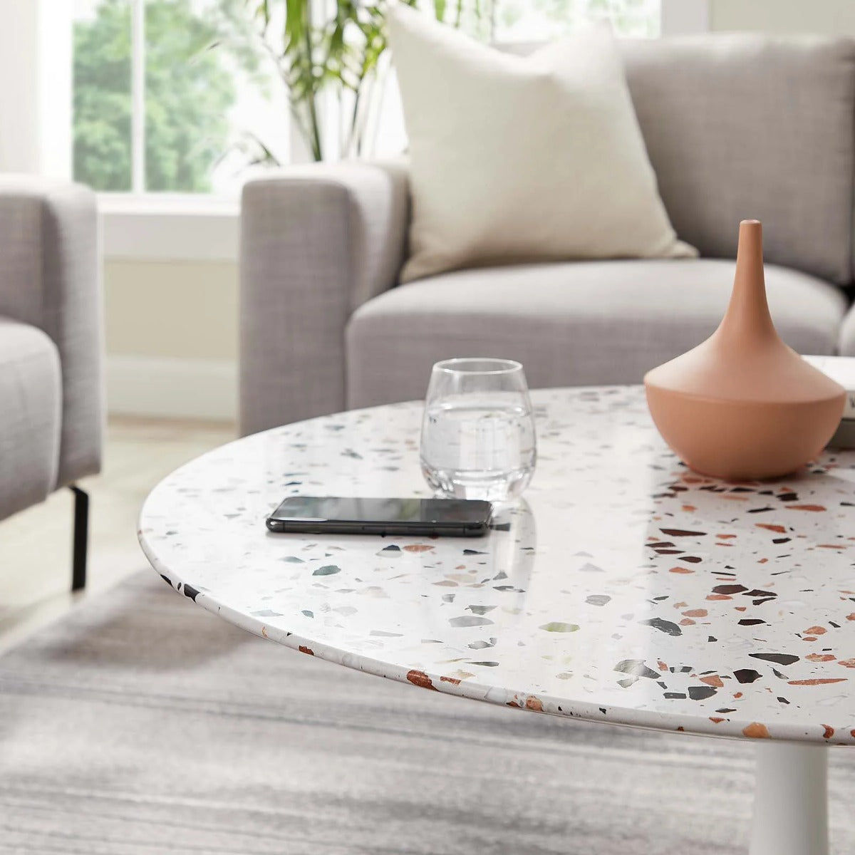 Let modern inspiration flow while gathered around the Lippa 36" Round Terrazzo Coffee Table. Perfect for hosting a morning cup of coffee or entertaining family and friends, this pedestal table features a spacious surface. Its round tabletop features a durable terrazzo construction and beveled edge for a contemporary yet timeless design. Embodying an iconic mid-century silhouette, this pedestal coffee table floats on a sleek tapered metal pedestal base with a chip-resistant lacquered finish. Includes non-marking felt pad to protect flooring. Assembly required.