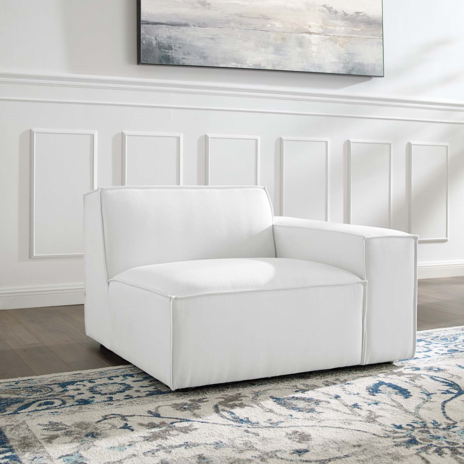 Create your custom living room and lounge area with the Restore Upholstered Fabric Right-Arm Sectional Sofa Chair. The Restore Right-Arm Chair appeals to minimalist elegance with a crisp design and broad lines accented with French piping details and polyester fabric upholstery. Dense foam padding and a pocket coil spring system in the cushions offer a luxe seating experience for your living room and lounge. The Restore Living Room Sofa Chair is solidly constructed from plywood and wood with non-marking foot caps to protect flooring and connectors between modular pieces. Chair Weight Capacity: 440 lbs.