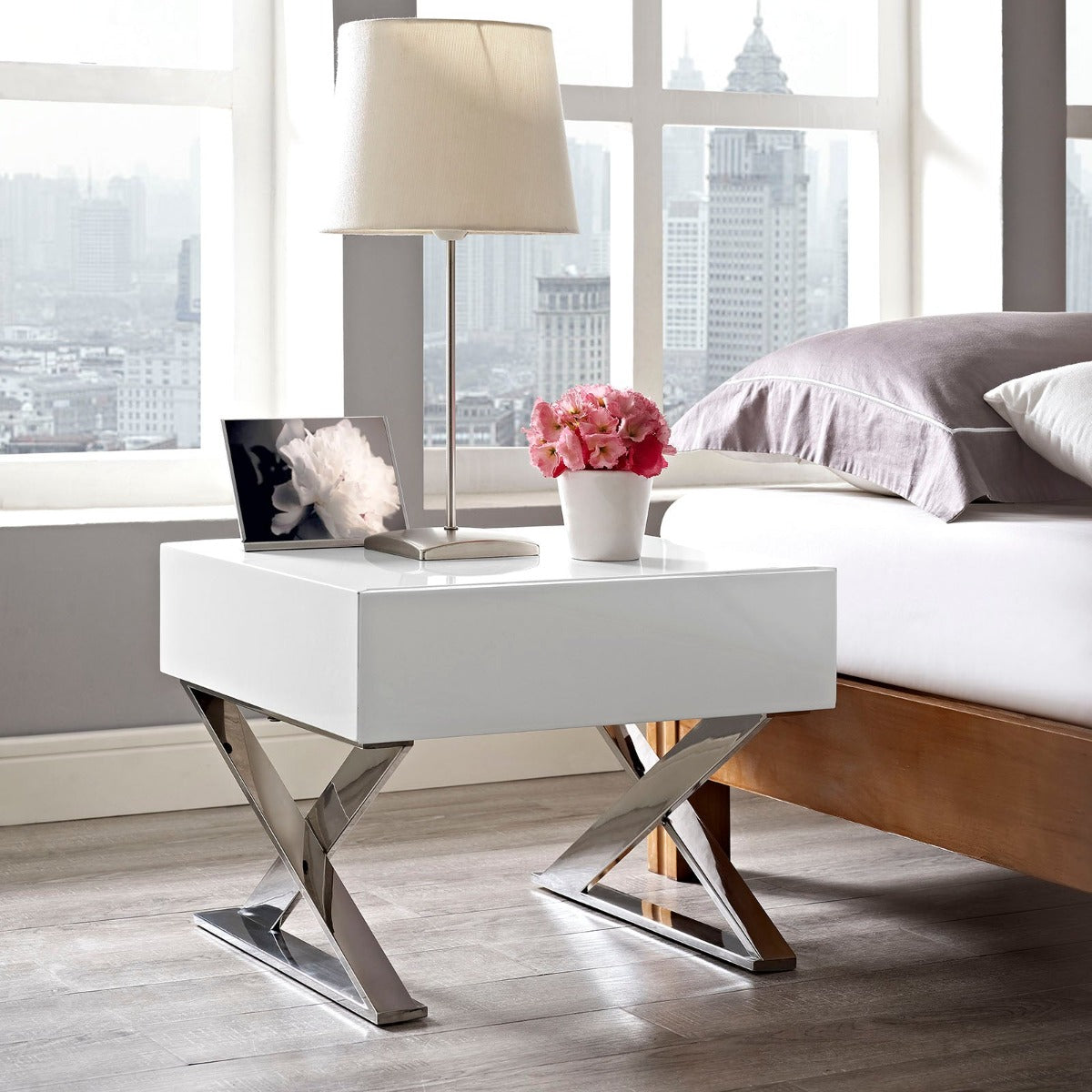 Create a space of distinction with the Sector Chrome Stainless Steel X Frame Nightstand End Table. Designed to impart a message of steady resolve, Sector Nightstand Table features a boxy high gloss veneer top with a smoothly gliding full drawer extension with metal drawer glides. This bedside table comes with a sleek polished chrome stainless steel x-frame base and non-marking foot pads to protect flooring integrity. Perfect as a bedside display table for your reading material, journal, table lamp, and other pre-sleep items, Sector Nightstand is an eye-catching retro modern addition that will enhance your contemporary home or apartment.