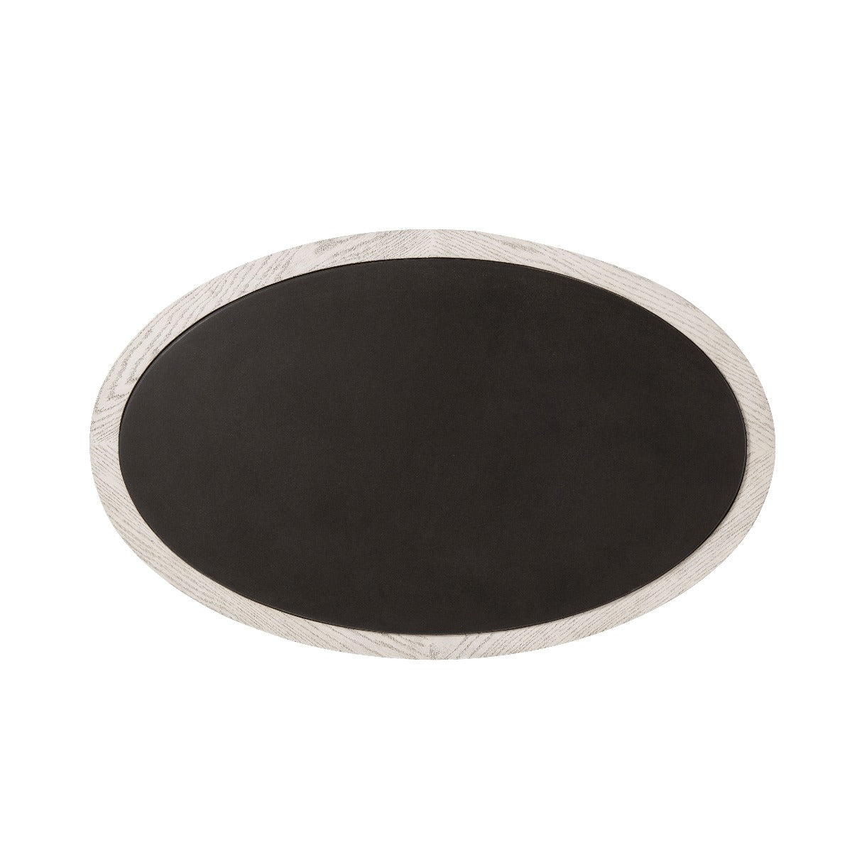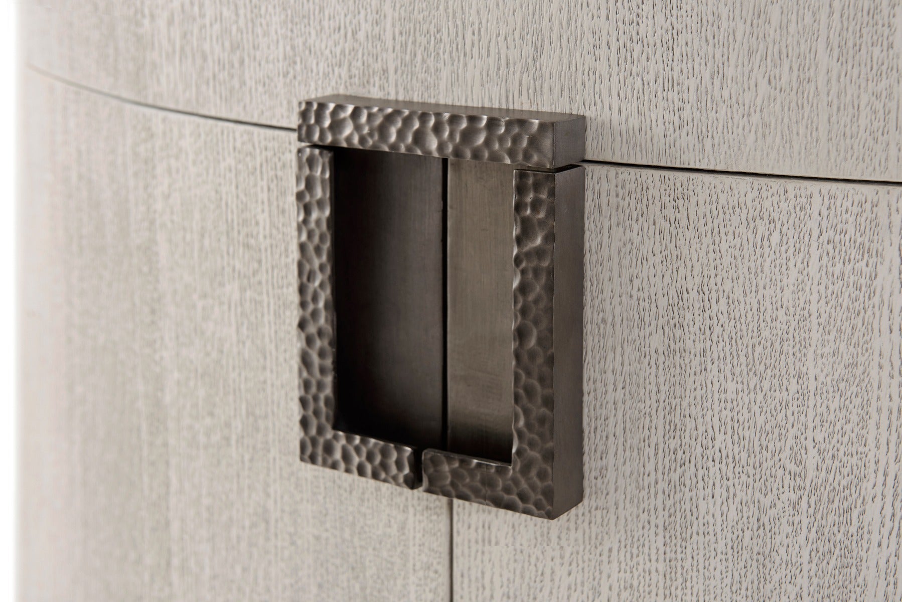 Nightstand Brushed Gowan Finish Quartered Oak Oval Basalt inset Top Tripartite Hammered Metal Handle with Matte Tungsten Finish Frieze Drawer and Cabinet Doors enclosing an Adjustable Shelf