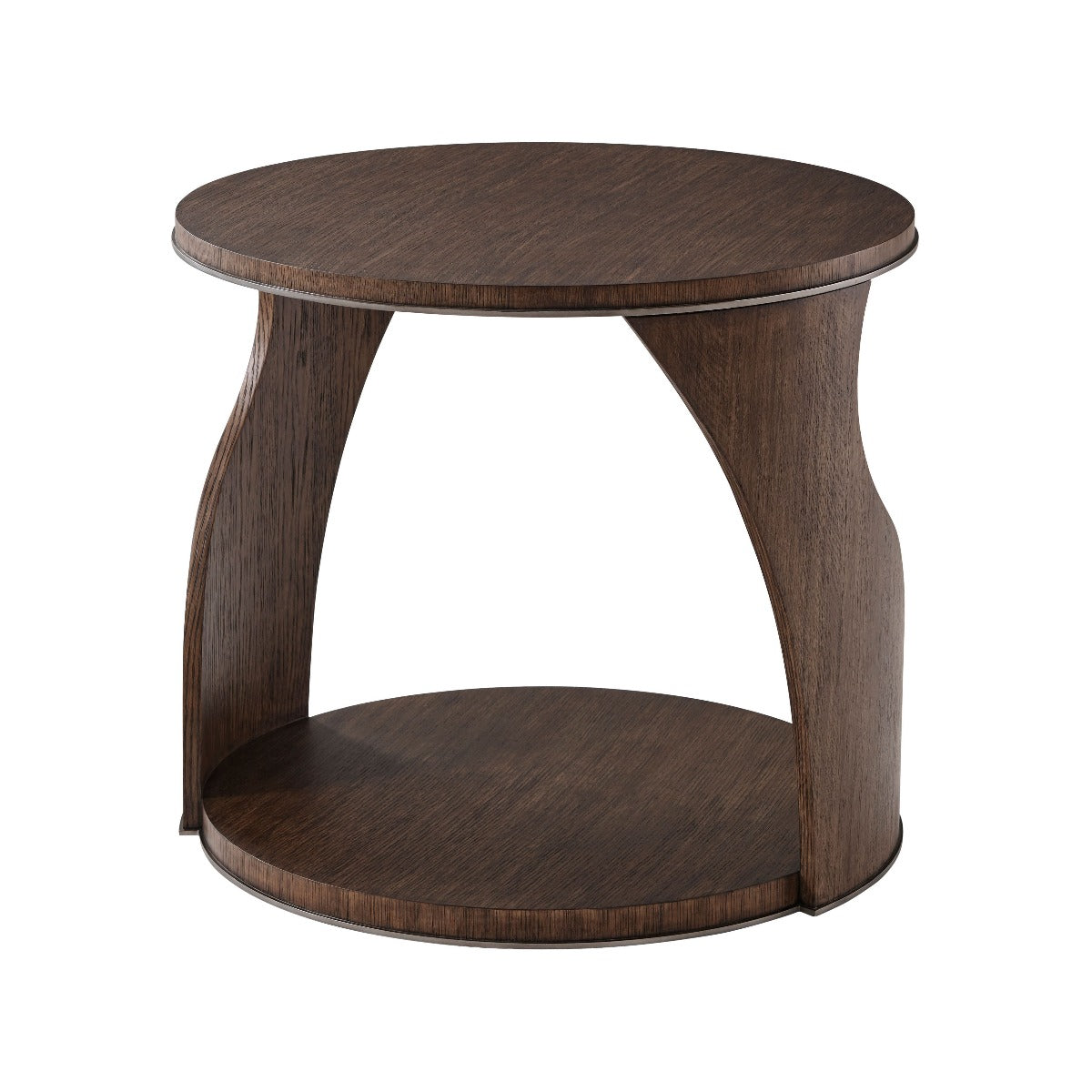 Side Table Brushed Quartered Oak Charteris Finish Circular Top and Undertier Offset Organic Curved Supports