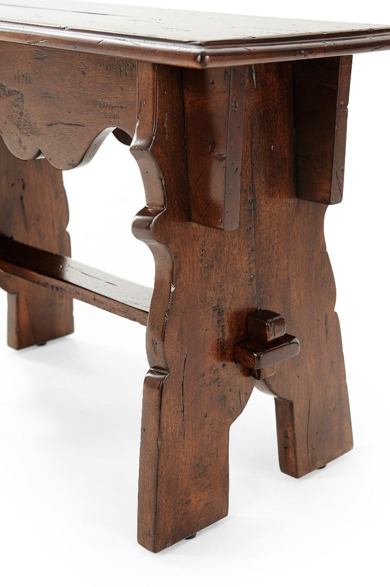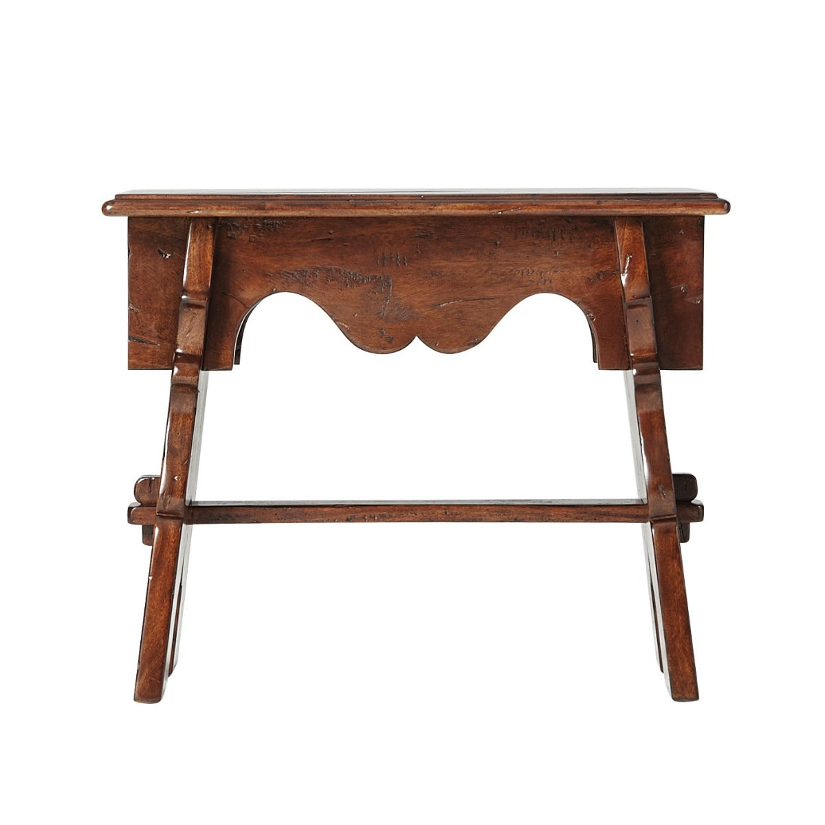 An antiqued wood 'Joynt' stool, with serpentine apron on pegged splay legs joined by a stretcher. The original 17th century.