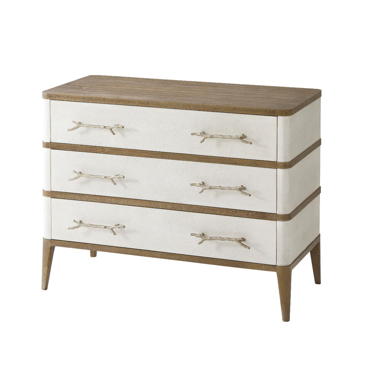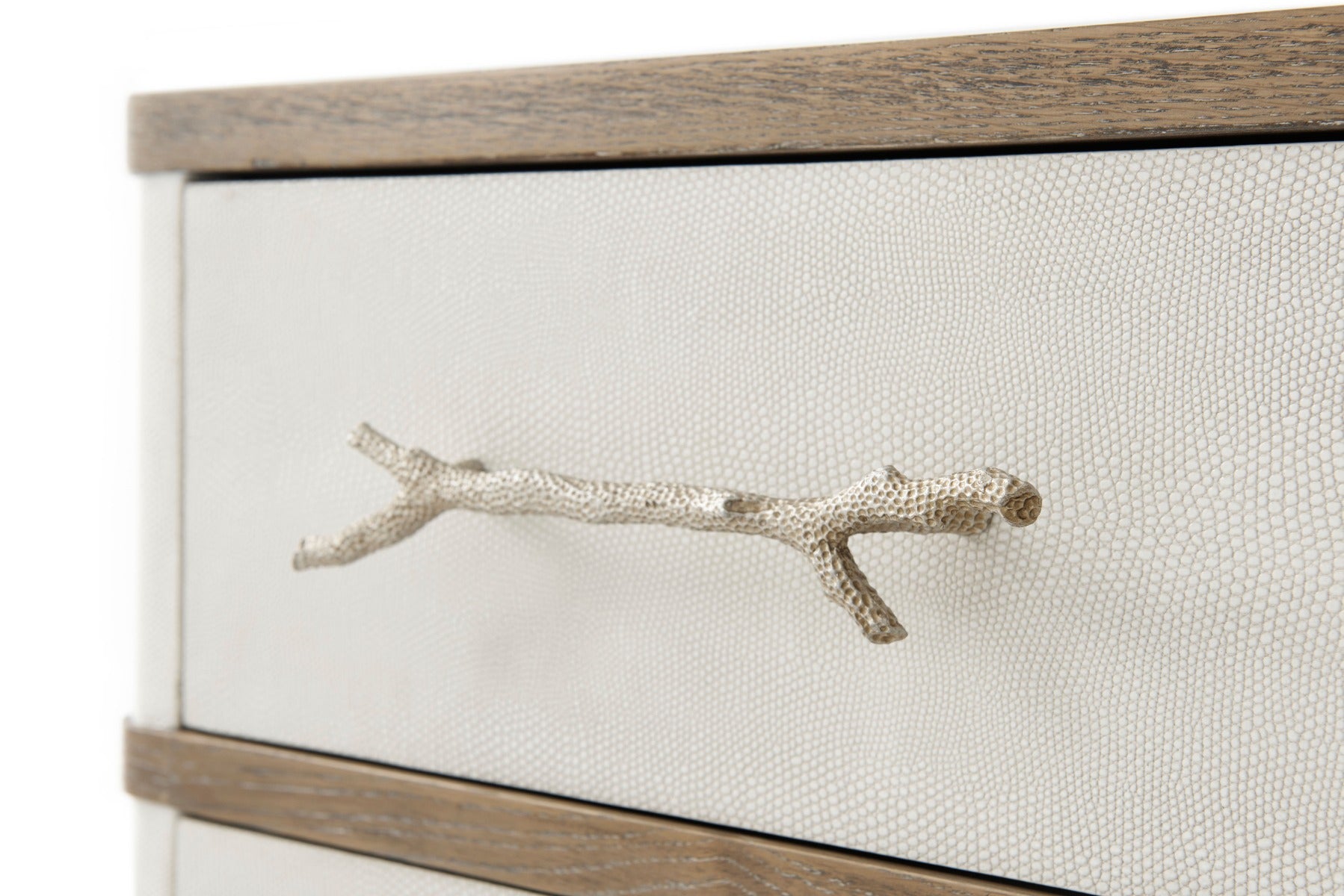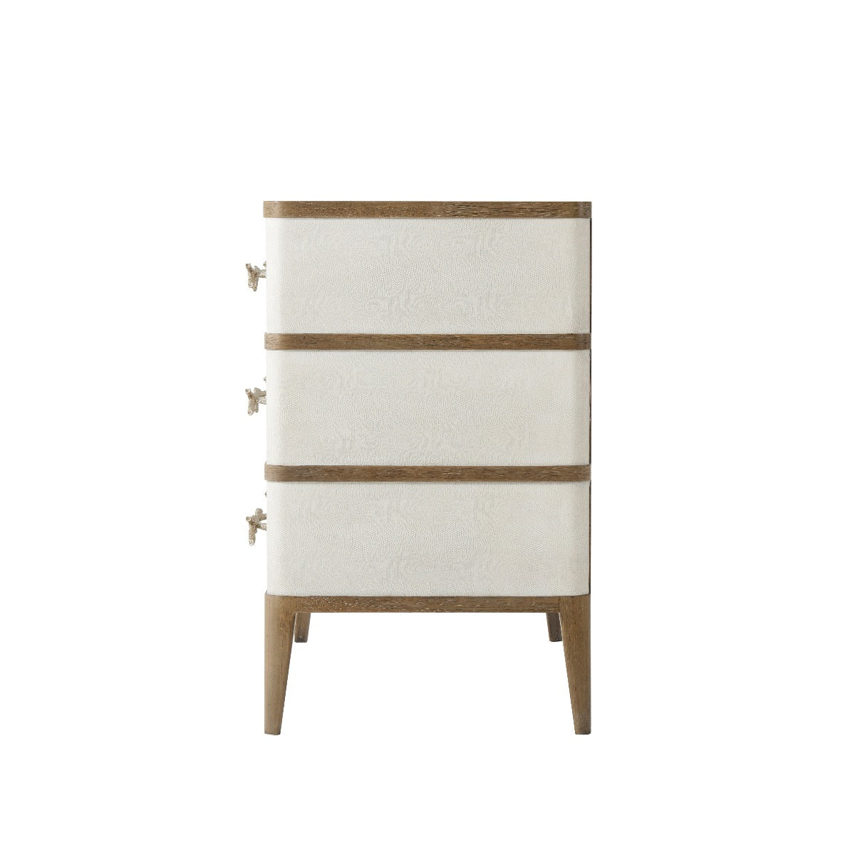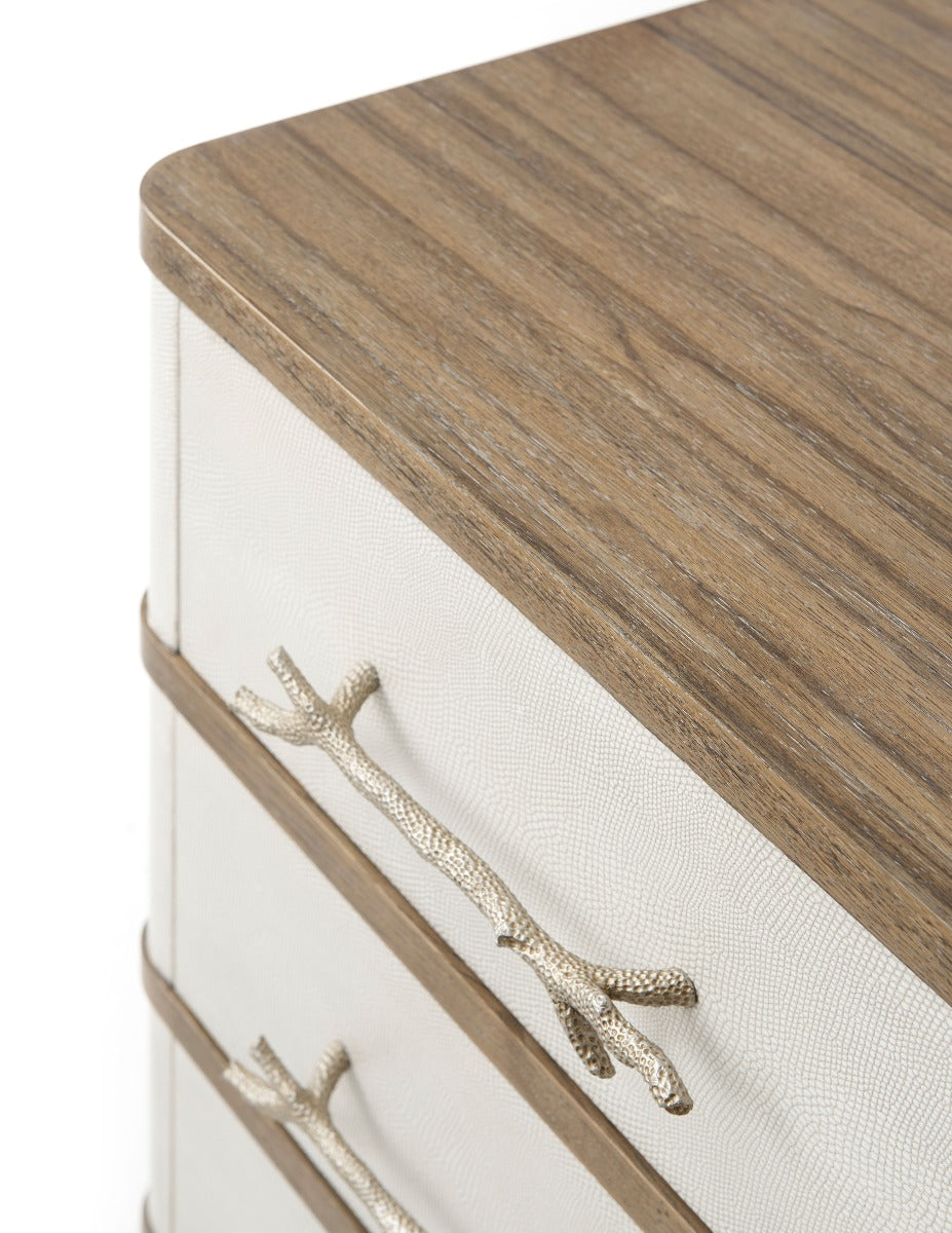 Nightstand or Chest Figured Ofram Veneer & Solid Oak Cerused Mangrove Finish Komodo Embossed Leather Panelled Three Drawers with New Champagne Finish Textured Coral Cast Handles