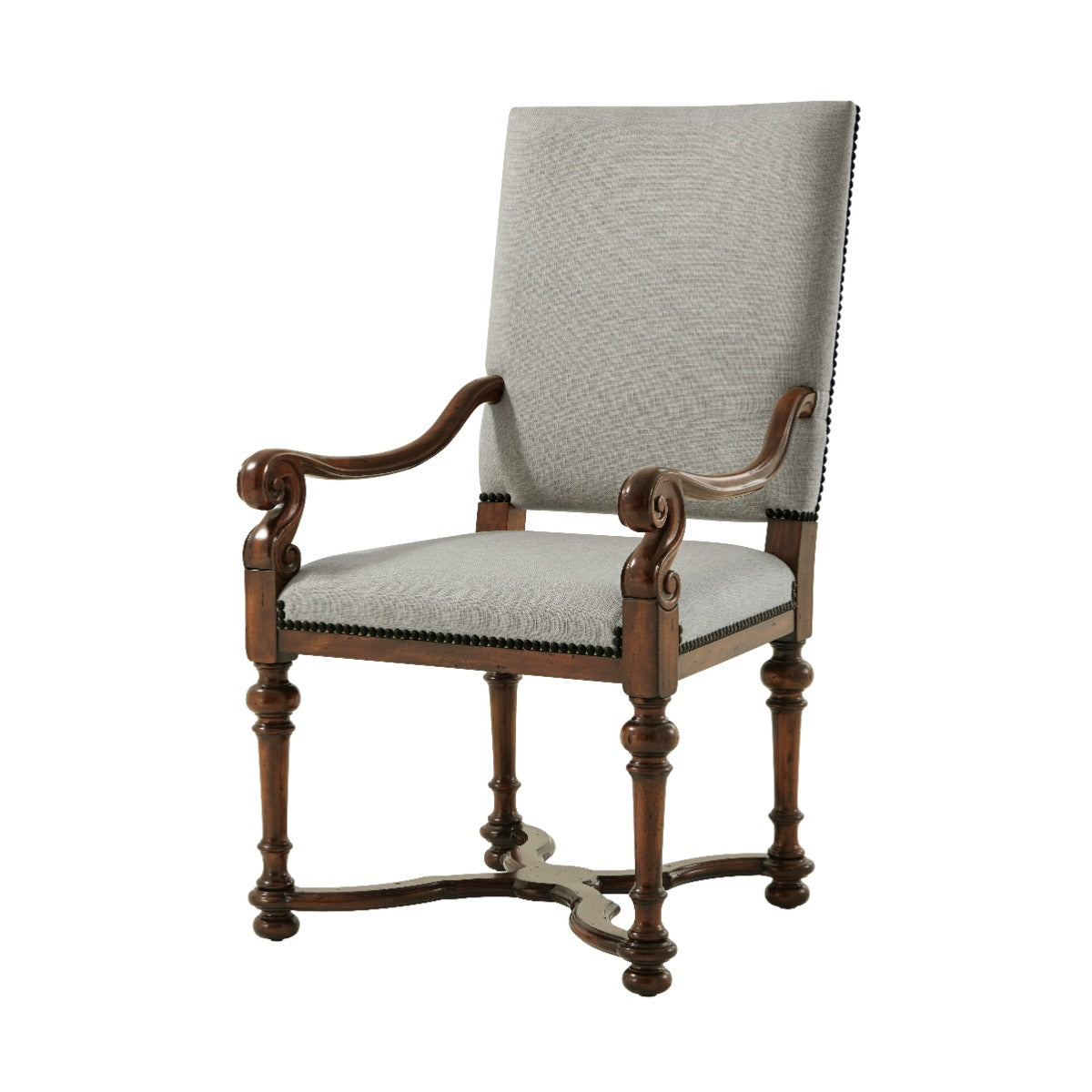 A hand carved armchair, the rectangular padded back and upholstered seat on turned tapering legs joined by a wavy ‘X’ stretcher. The original William and Mary.