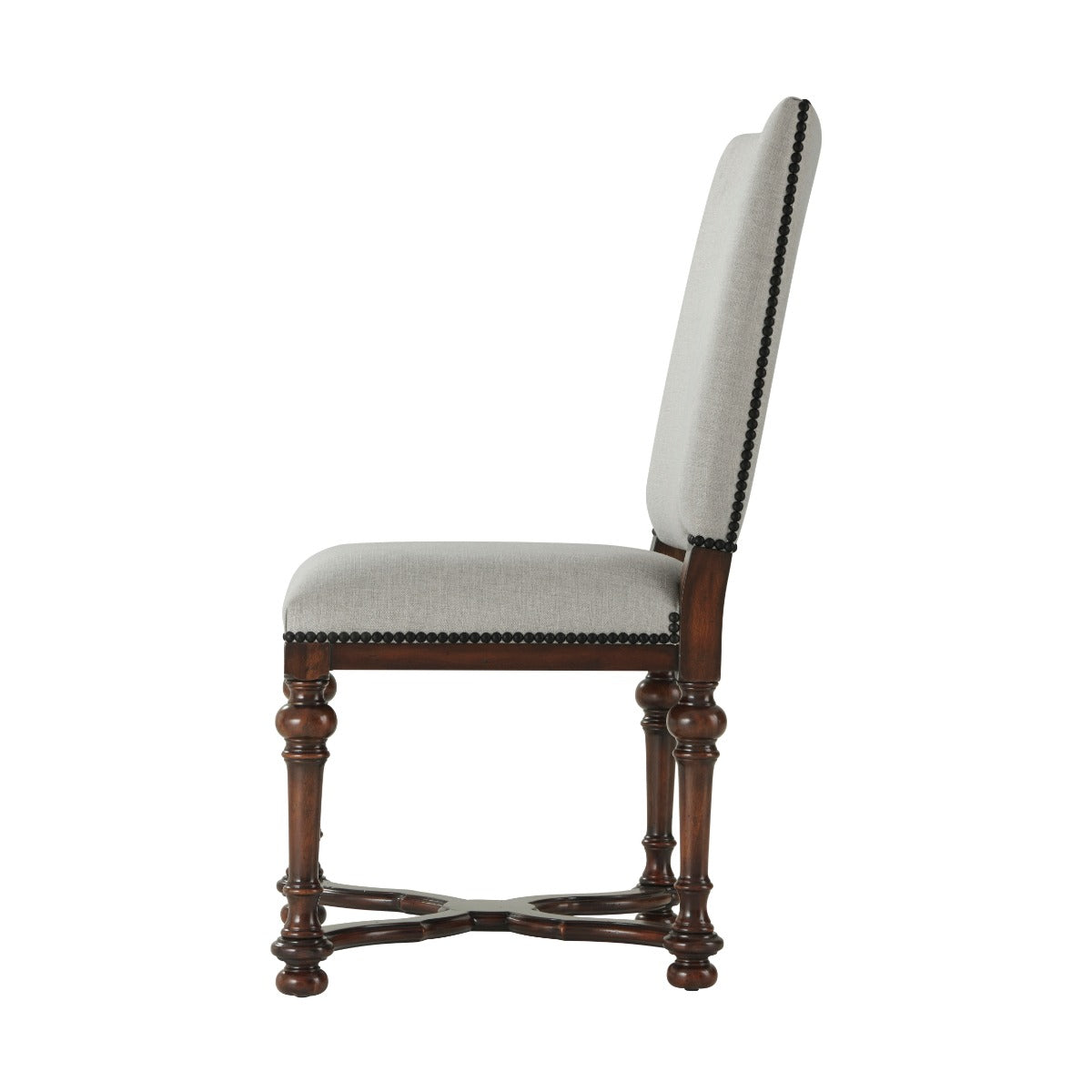 A hand carved side chair, the rectangular padded back and upholstered seat on turned tapering legs joined by a wavy ‘X’ stretcher. The original William and Mary.