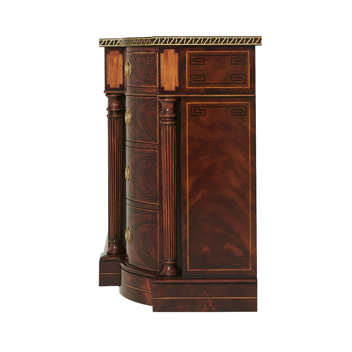 A fine mahogany veneered and yew burl banded buffet, the break bowfront top with an ebony and brass inlaid edge, above an arrangement of four frieze drawers and central cabinet doors enclosing an adjustable shelf, flanked by two sets of three graduated drawers and turned and tapering columns, on line strung plinth base.