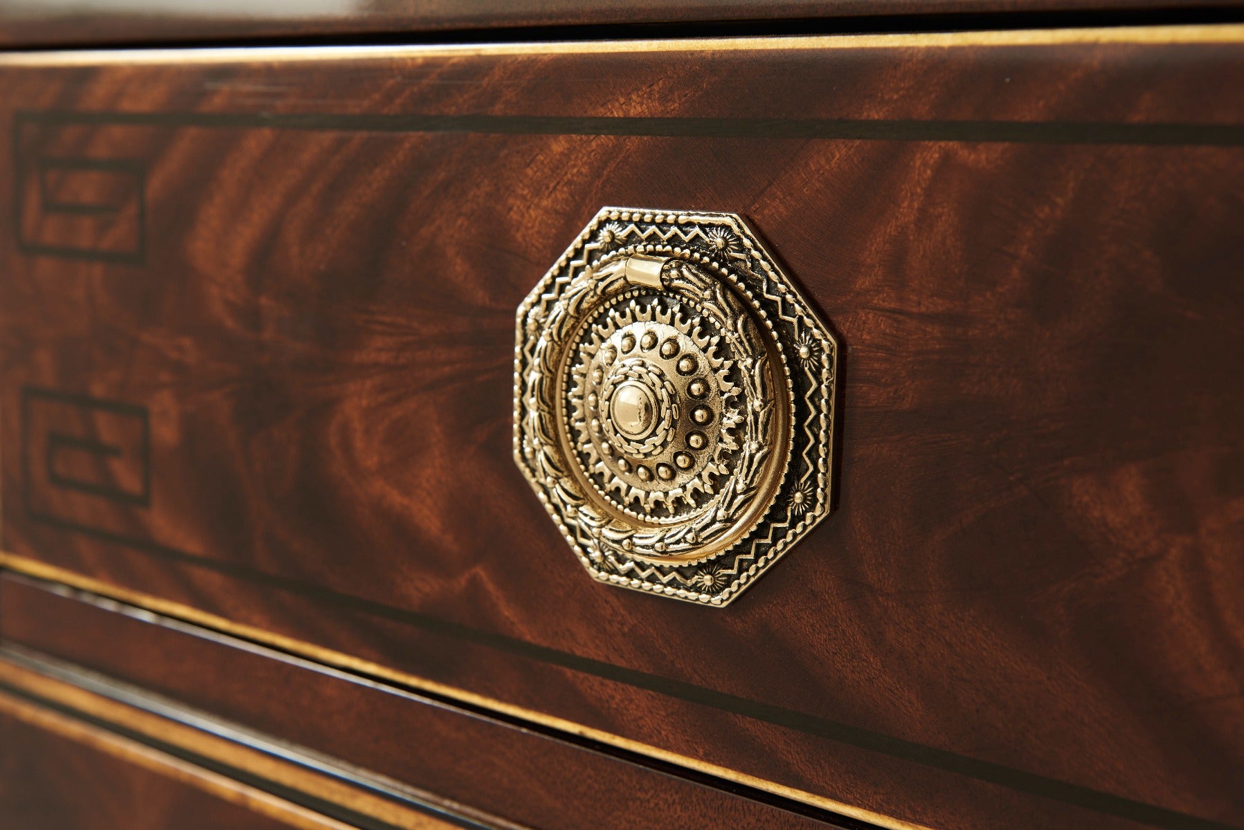 - Main Material: Flame Mahogany Veneer, Yew Burl Veneer, Brass