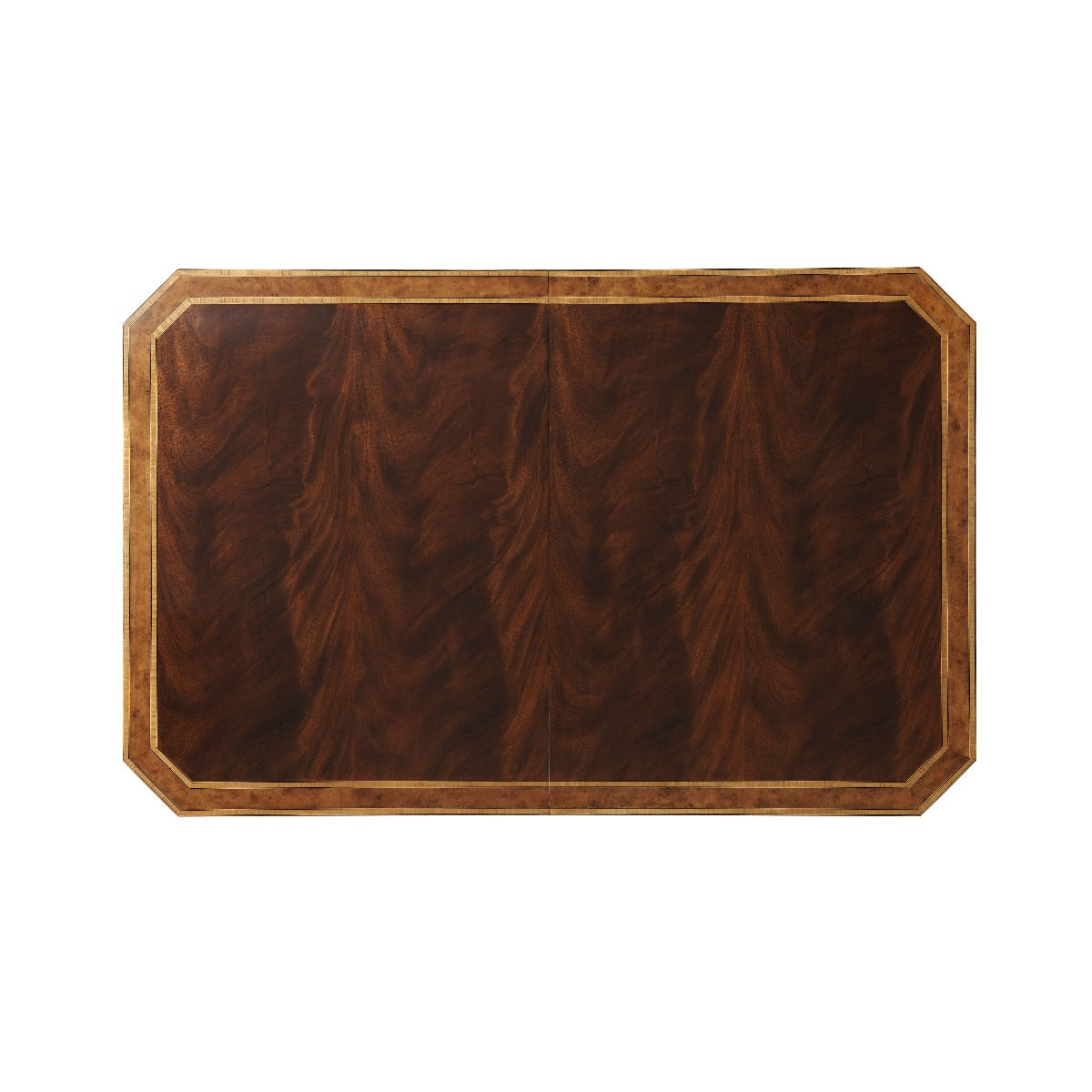 A mahogany and swirl veneered and crossbanded extending dining table, the rectangular top opening to accommodate two additional self storing leaves, the panelled satinwood veneered frieze above a bold base of four turned reeded columns on a platform base issuing four outswept legs with brass cappings.