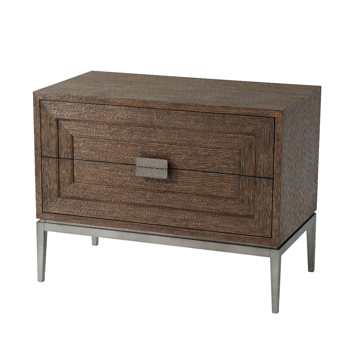 Nightstand Brushed Charteris Finish Quartered Oak Two Drawers with Relief Inlaid Angular Centric Lines Hammered Metal Handle with Matte Tungsten Finish Raised on Matte Tungsten Finish Legs