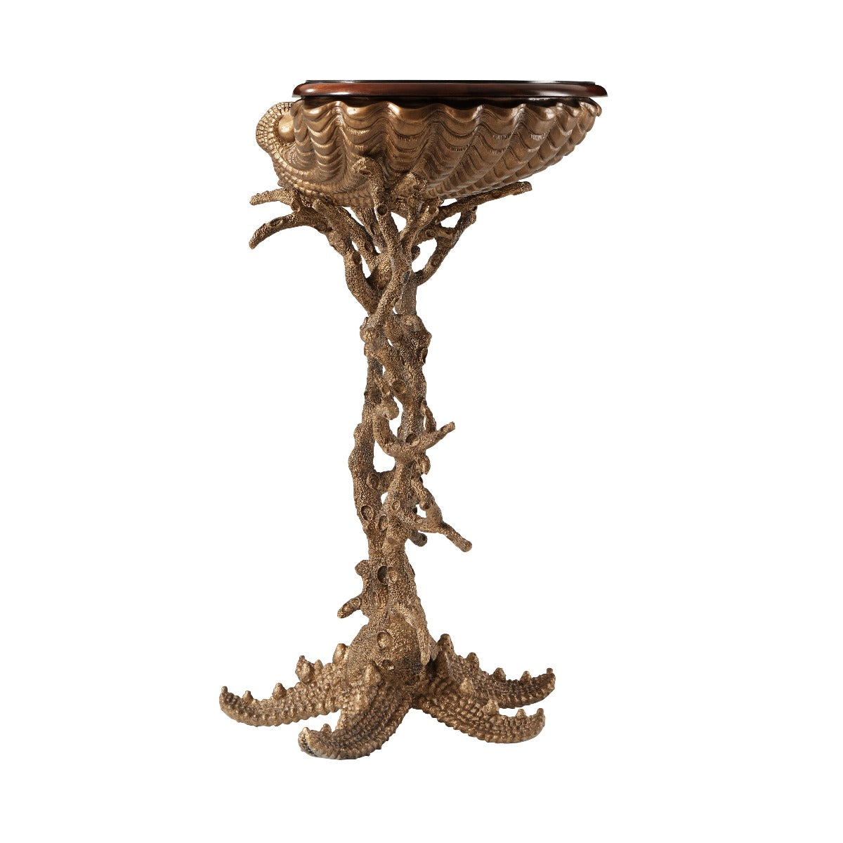 A highly unusual Grotto table, the rounded 'D' shaped flame veneered and morado crossbanded top above a gilt metal cast base of a giant clam shell supported by coral legs issuing from a starfish. Inspired by Renaissance shell decorated Grottos.