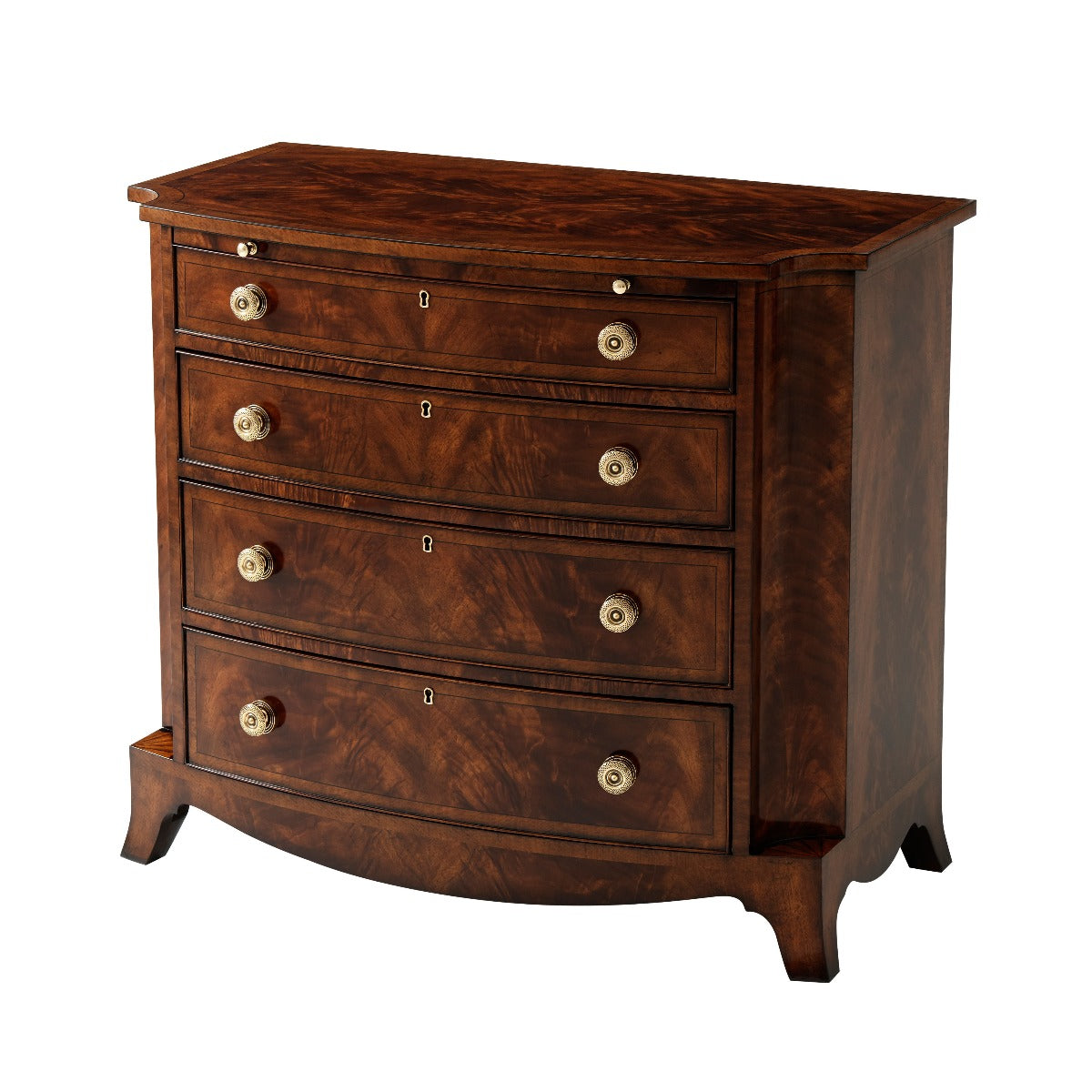 A fine flame veneered chest of drawers, the bowfront satinwood crossbanded top with concave corners and uprights, above a veneered slide and four graduated bowfront drawers, with natural brass handles, on splay legs.