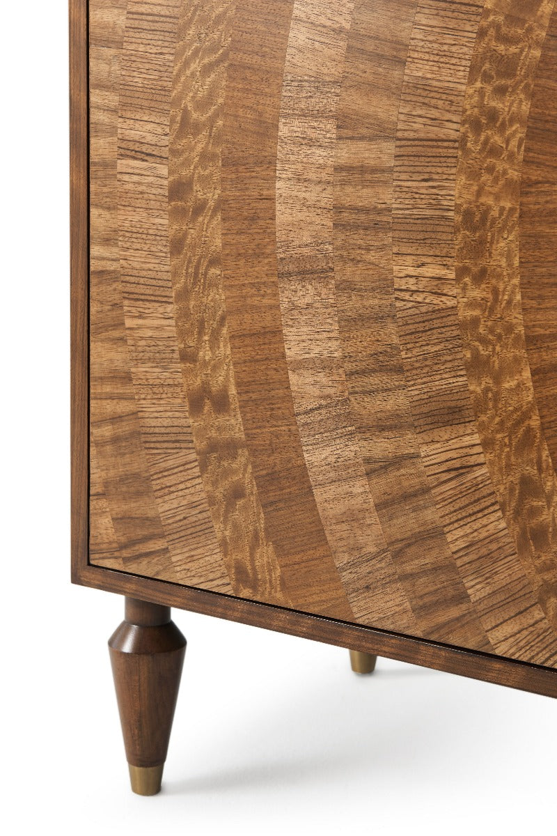 Buffet Hyedua Veneered Case Sunburst Specimen Parquetry Doors Open Circle Brass Handle Turned & Tapering Legs with brass Finish Cappings Three Section Interior with Adjustable Shelves