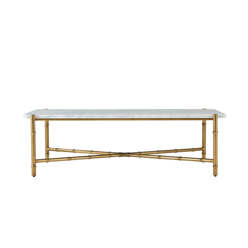 Gentle, slender lines form a light and airy design in the Kesden Cocktail Table. A graceful combination of white bianco marble atop an organic base in a satin bronze finish.