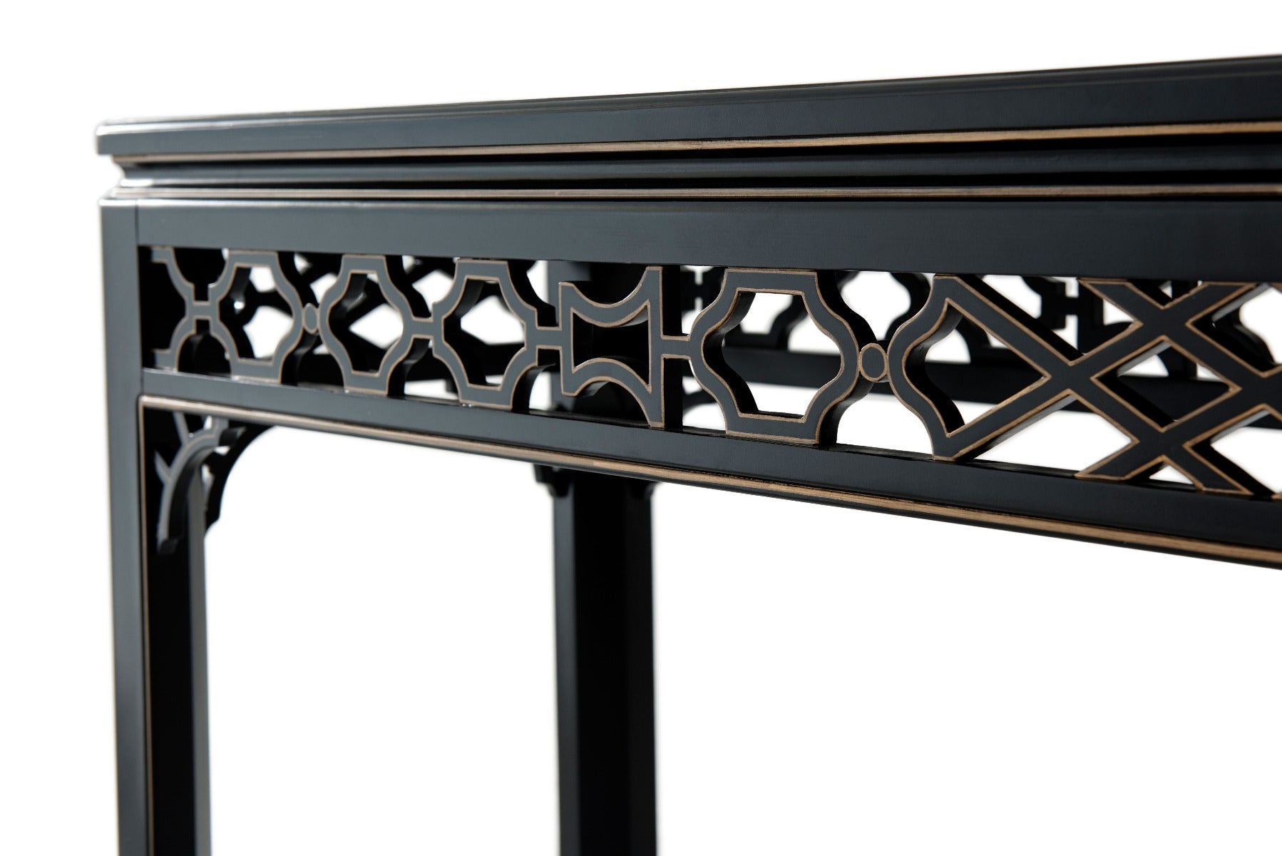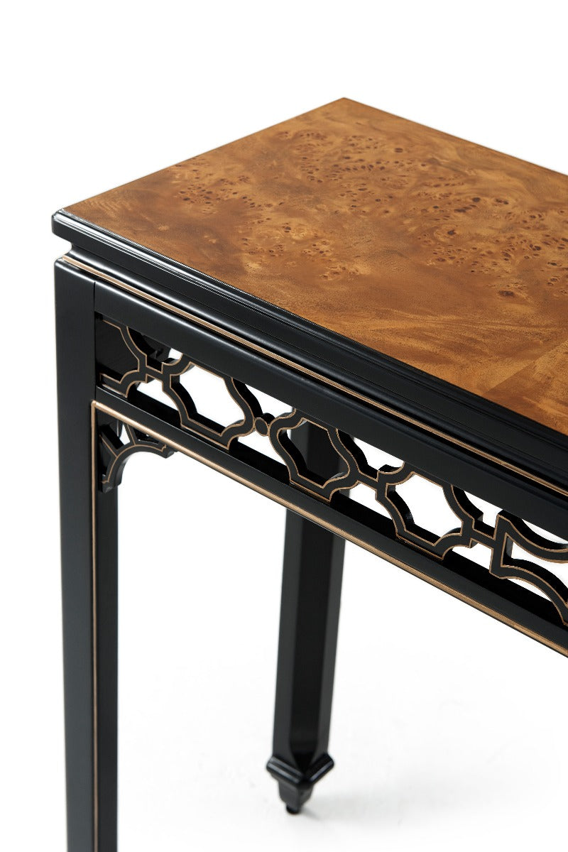 A fine ebonized and poplar burl veneered Console Table with gilt detailing, the molded edge rectangular top veneered with poplar burl, the pierced fretwork frieze on chamfered legs with Pointe feet.