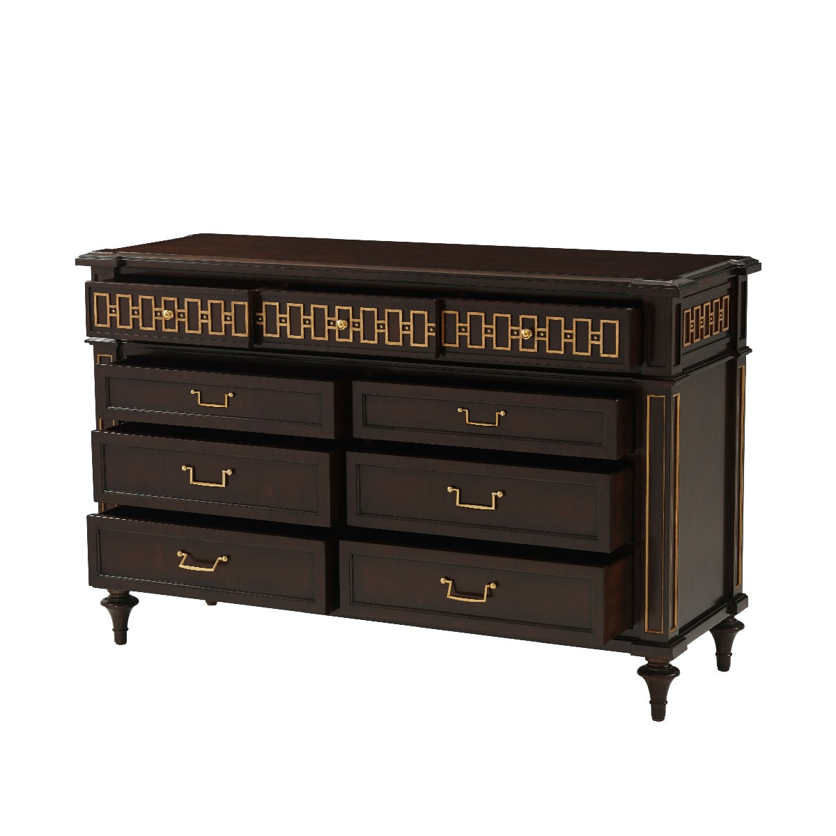 There's a not-so-quiet dignity to the McCombs Dresser with three fretwork relief frieze drawers, and six generously sized paneled drawers with Hampton finish brass handles below. A chamfered-edge dresser top and turned tapered legs balance details from top to bottom.
