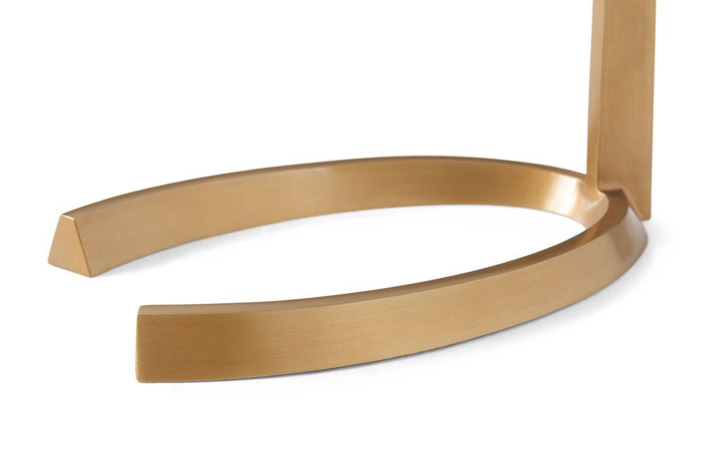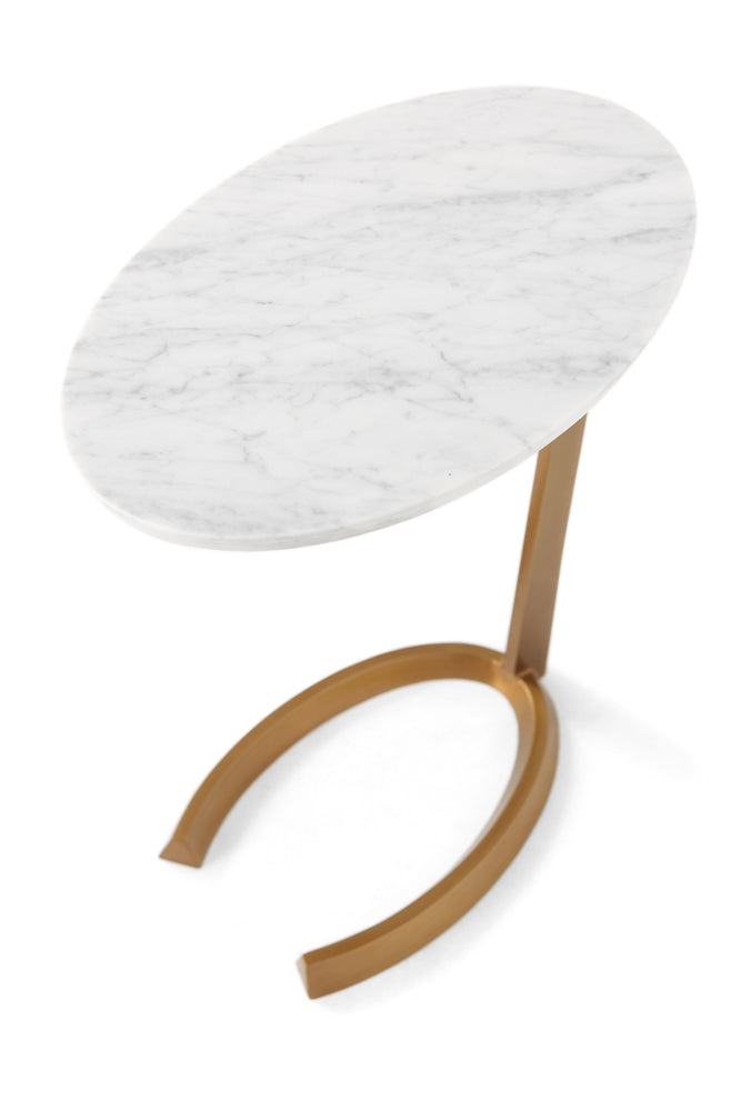Cantilever Accent Table Canted Edge Oval Bianco Carrara Marble Top Modern Brass Finish Tapered Bullion Section Support Horseshoe Support