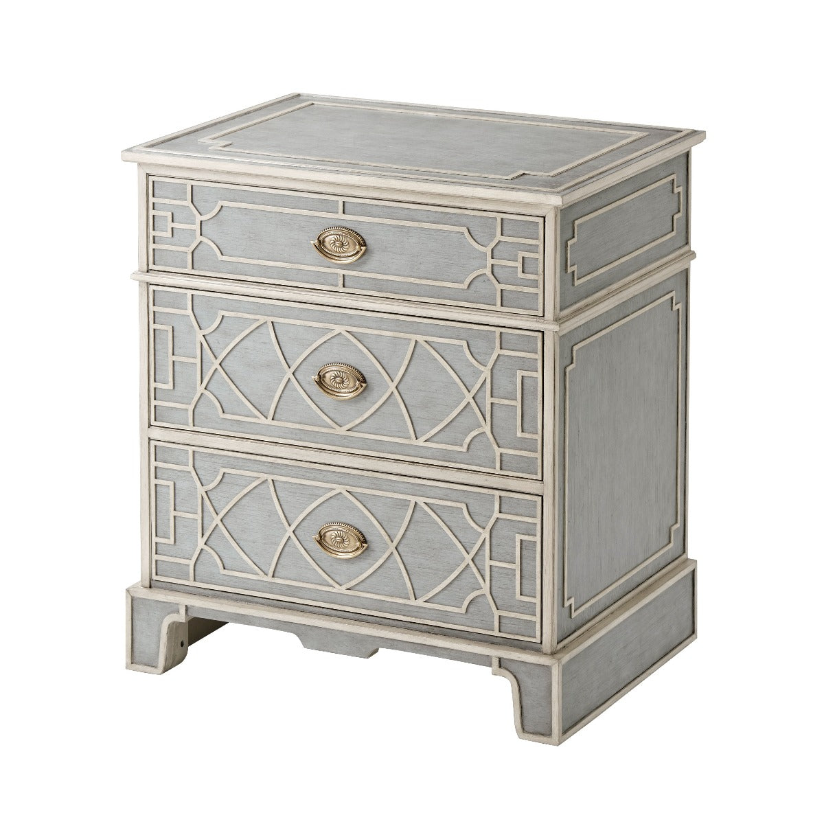 Grey Limestone Painted with Light Stockton Fretwork Three Blind Fretwork Drawers with Brass Handles Bracket Feet