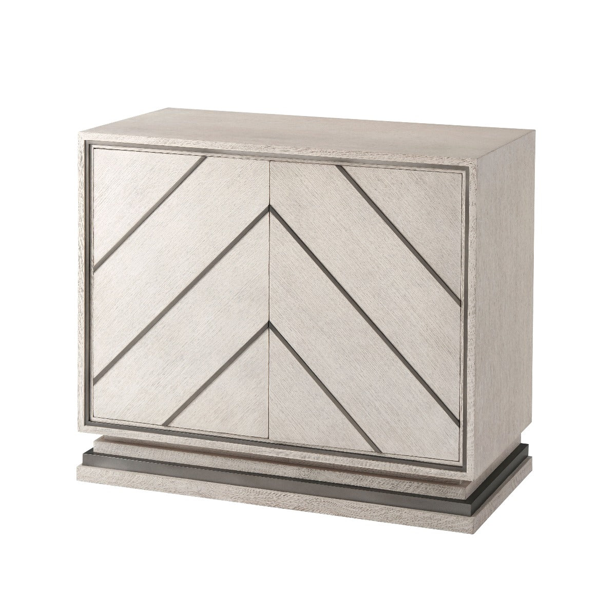 Decorative Cabinet Brushed Quartered Oak Veneered Gowan Finish Two Doors with Matte Tungsten Finish Chevron Overlay Enclosing Two Adjustable Shelves Stepped Inset Base