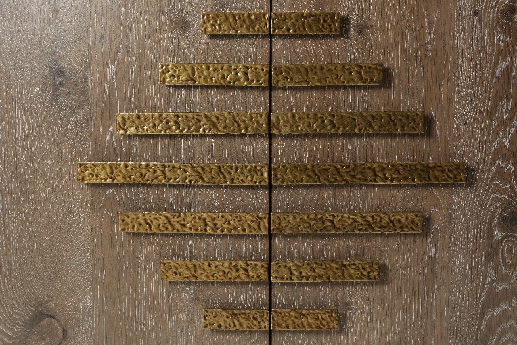 Cabinet Aged oak Veneered with Cloudy Bay Finish Textured Brass Finish Handles Two Section Grey Lacquer Interior Adjustable Shelves