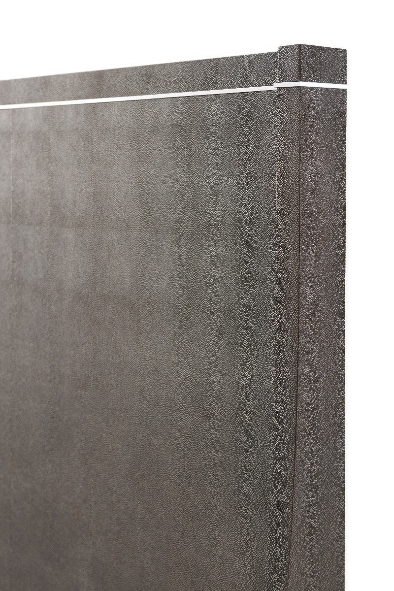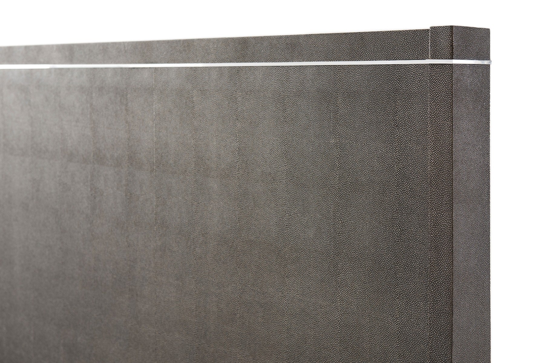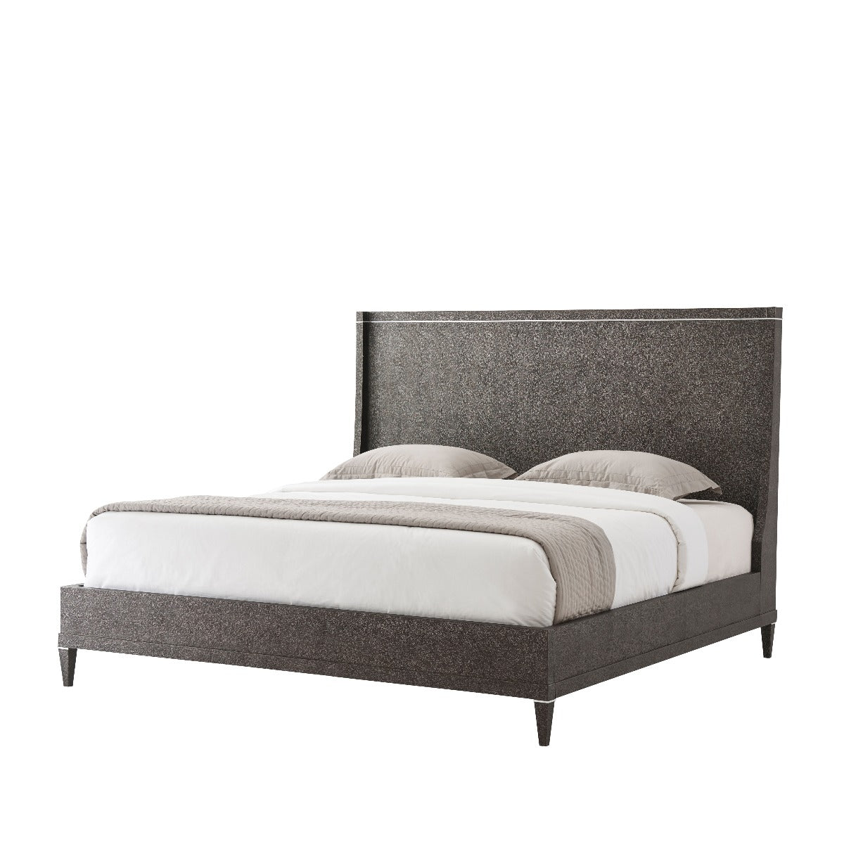 US King Bed Tempest Finish Shagreen Embossed Leather Wrapped Headboard with Downswept Wings Polished Nickel Molding Details Stepped Rail Details with Square Tapering Legs with Molding Accents