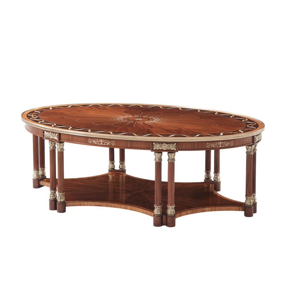 A very fine mahogany and etimoe veneered cocktail table, the Morado and Primavera crossbanded top with fine stringing and a paper twist marquetry design in sycamore and mother of pearl, inlaid to the center with a bold flowerhead with mother of pearl floral details, bound in brass above a paneled frieze with floral brass accents and brass inlay, on fluted columns with acanthus capitals and bases, joined by a Primavera crossbanded concave sided undertier.