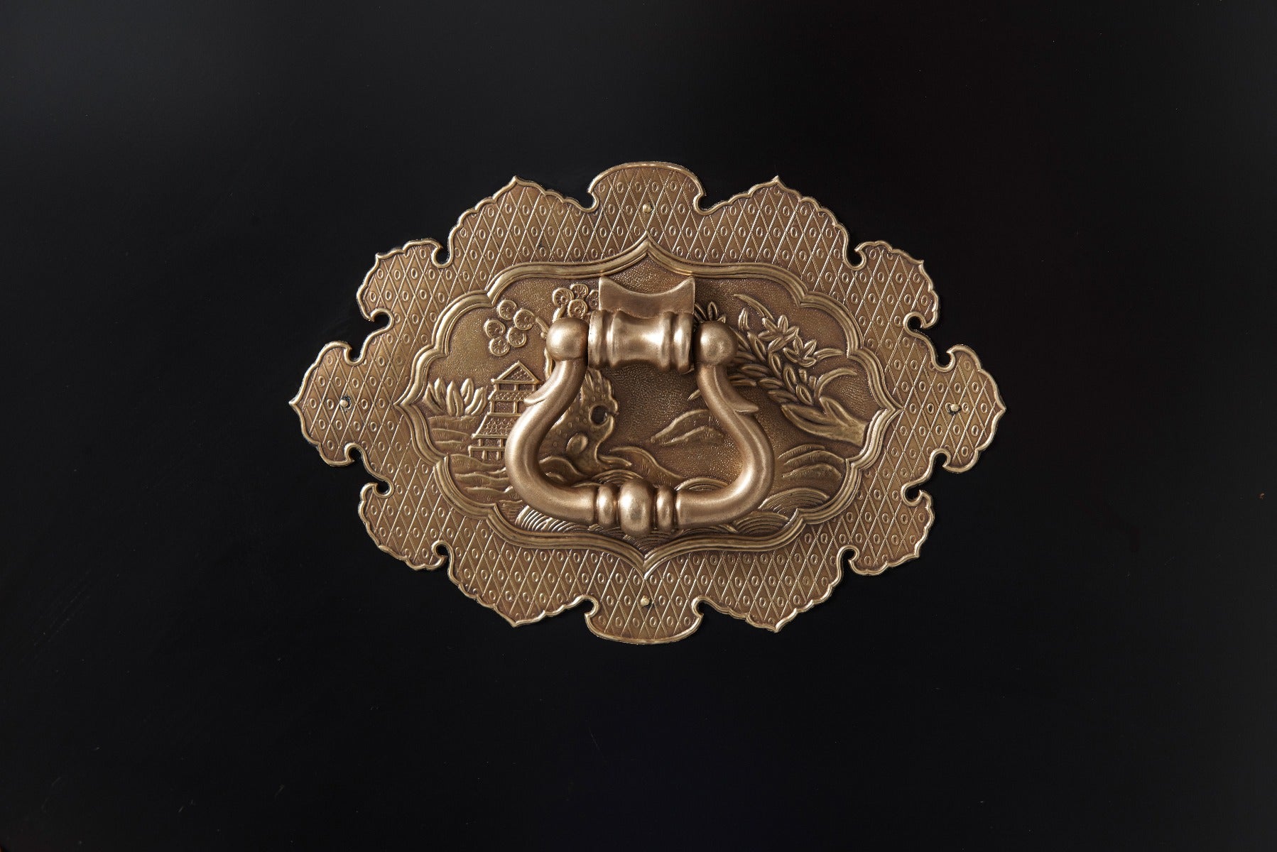 A finely hand painted and black lacquered cabinet on stand, the cabinet with gold leaf and hand painted decoration of peacocks in a landscape, with fine repousse chased brass mounts, on a base with chamfered legs and fretwork spandrels hand painted in floral and lattice decoration. The LED lit interior fitted as a bar with a mirror back and adjustable glass shelf.