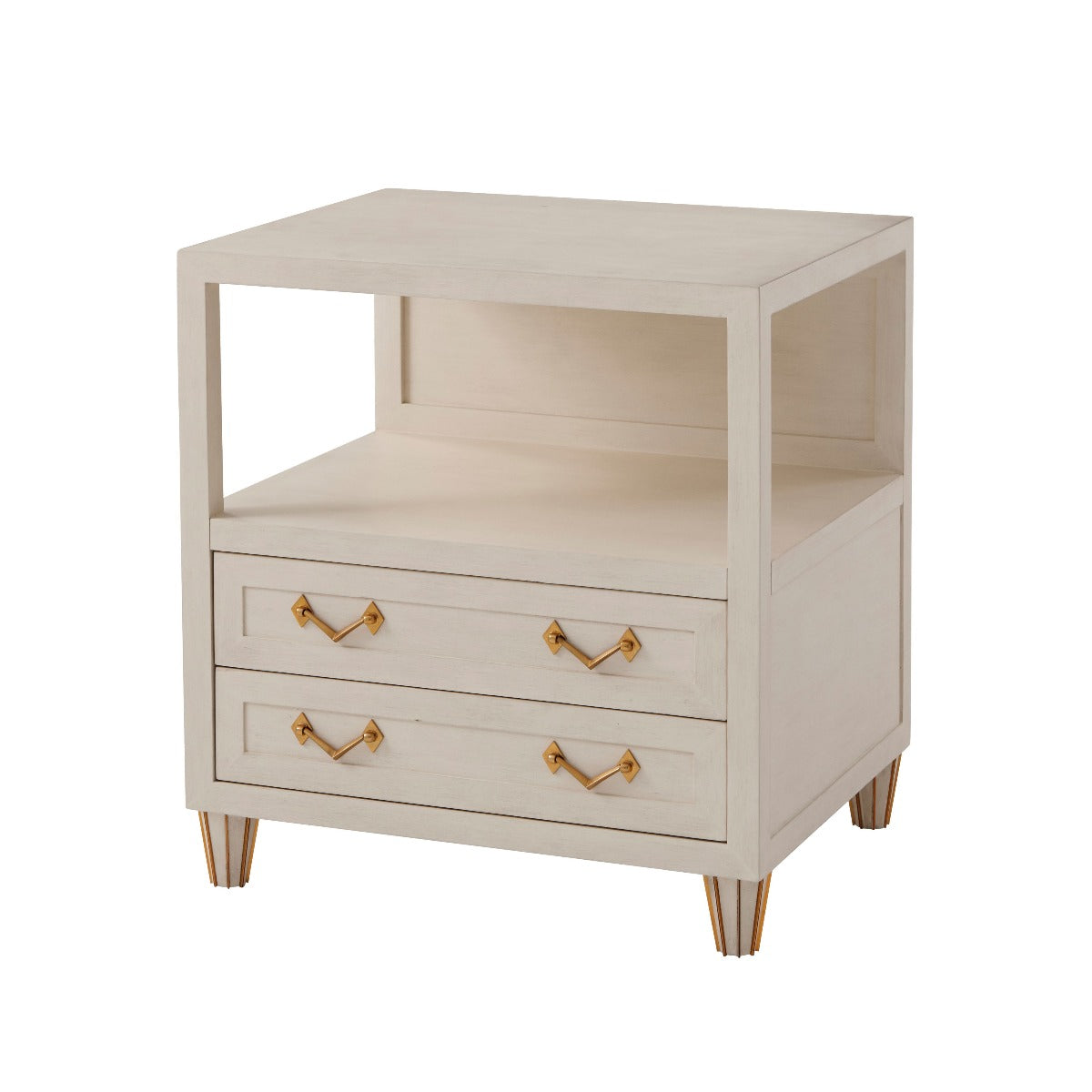 Sometimes nightstand, accent table or end table, sleek-lined Regina works a room with modern finesse. Ample storage and display space with one open shelf and two drawers with jewelry-like Hampton Brass finish handles. Set on octagonal tapered feet.