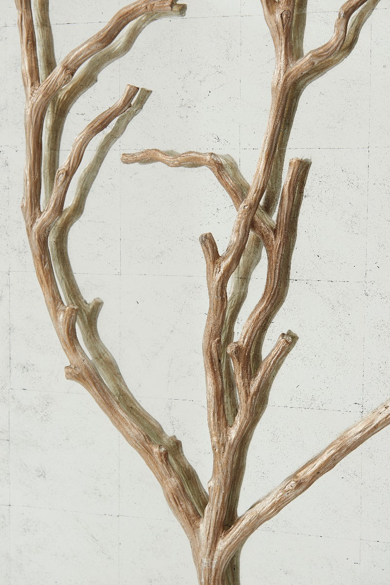 A set of three silvered metal and silvered wood framed wall panels, each rectangular frame with a cast branch overlaid on an antiqued hand leafed mirror back.