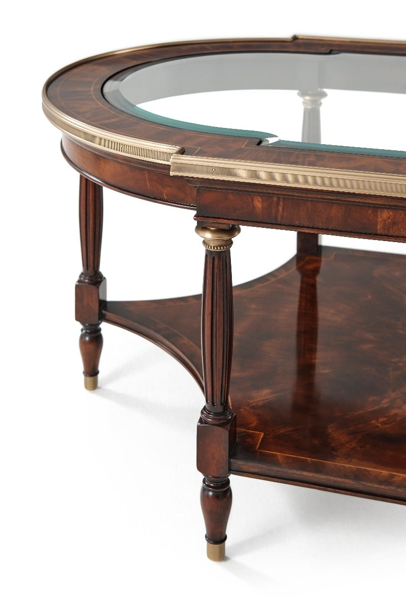 Brass Bound Breakfront Oval Top Flame Veneered, Crossbanded and Sycamore Strung Top Beveled Glass Inset 'Marlborough' Finish Frieze above Six Brass Capital & Fluted Legs Joined by a Concave Sided Undertier Turned Legs with Brass Cappings