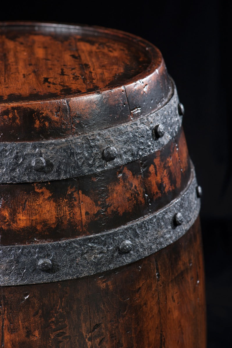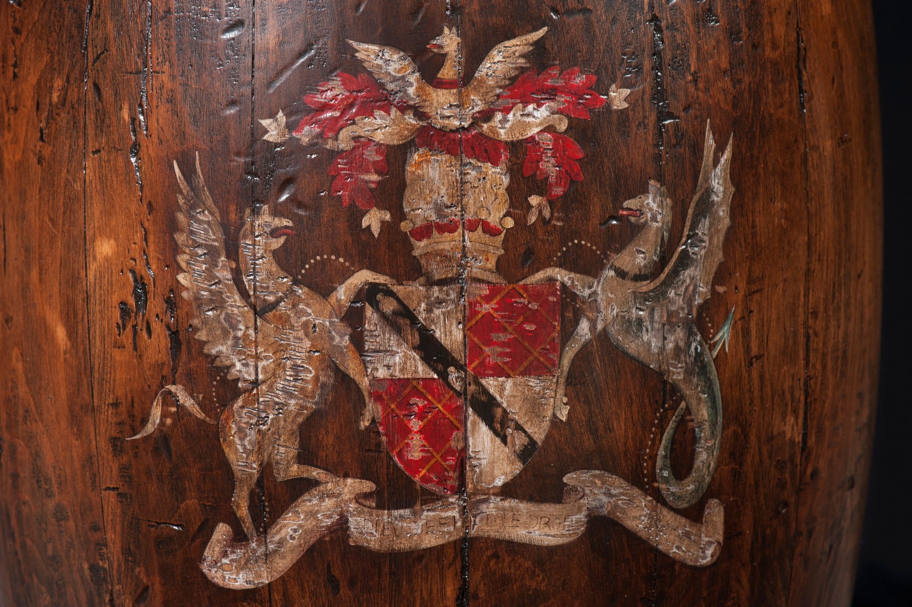 An antiqued wooden barrel, the circular top above planked sides bound by hand-forged iron riveted straps and hand painted with the Spencer coat of arms.