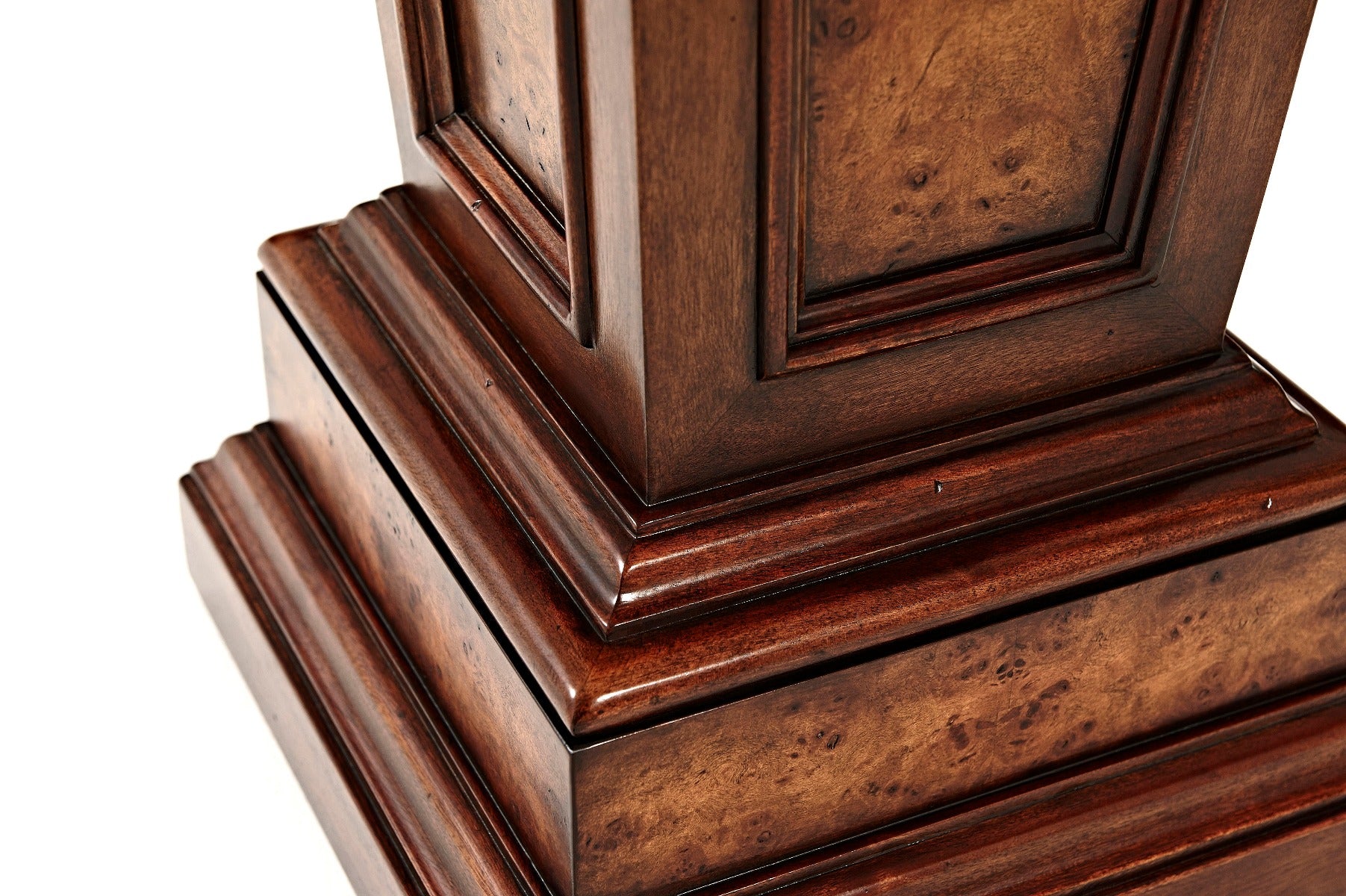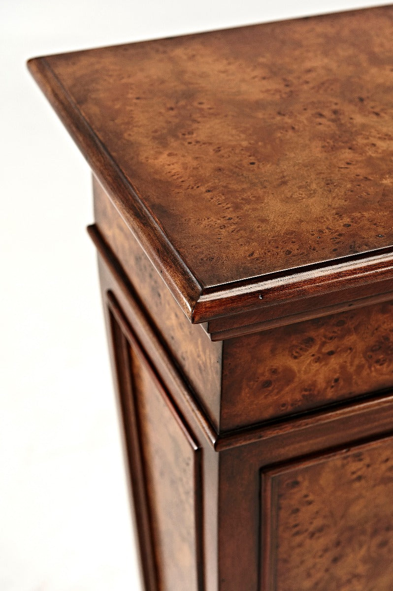 A Classical poplar burl panel tapered pedestal, with a square top and a stepped plinth base. The original Louis XVI.