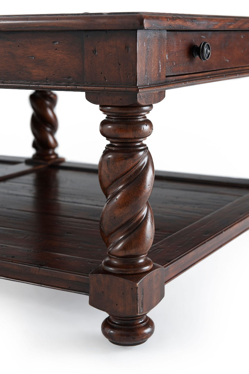 An antiqued wood cocktail table with two end drawers, on spiral turned legs joined by an solid panelled undertier. The original 17th century.