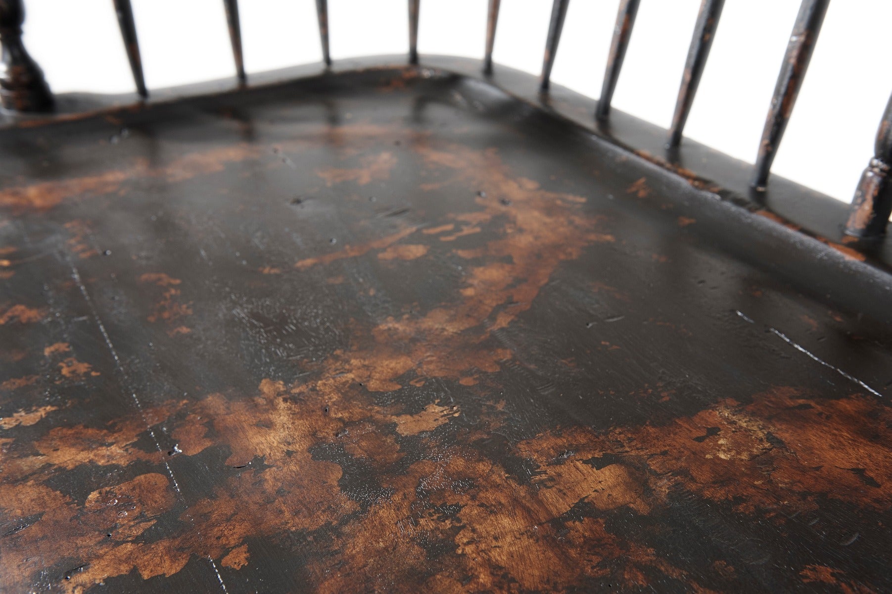 A rustic painted hoop back bench, the triple arched back with turned slats and arms with turned uprights, the shaped seat above turned splayed legs. Inspired by an 18th century Hickory original.