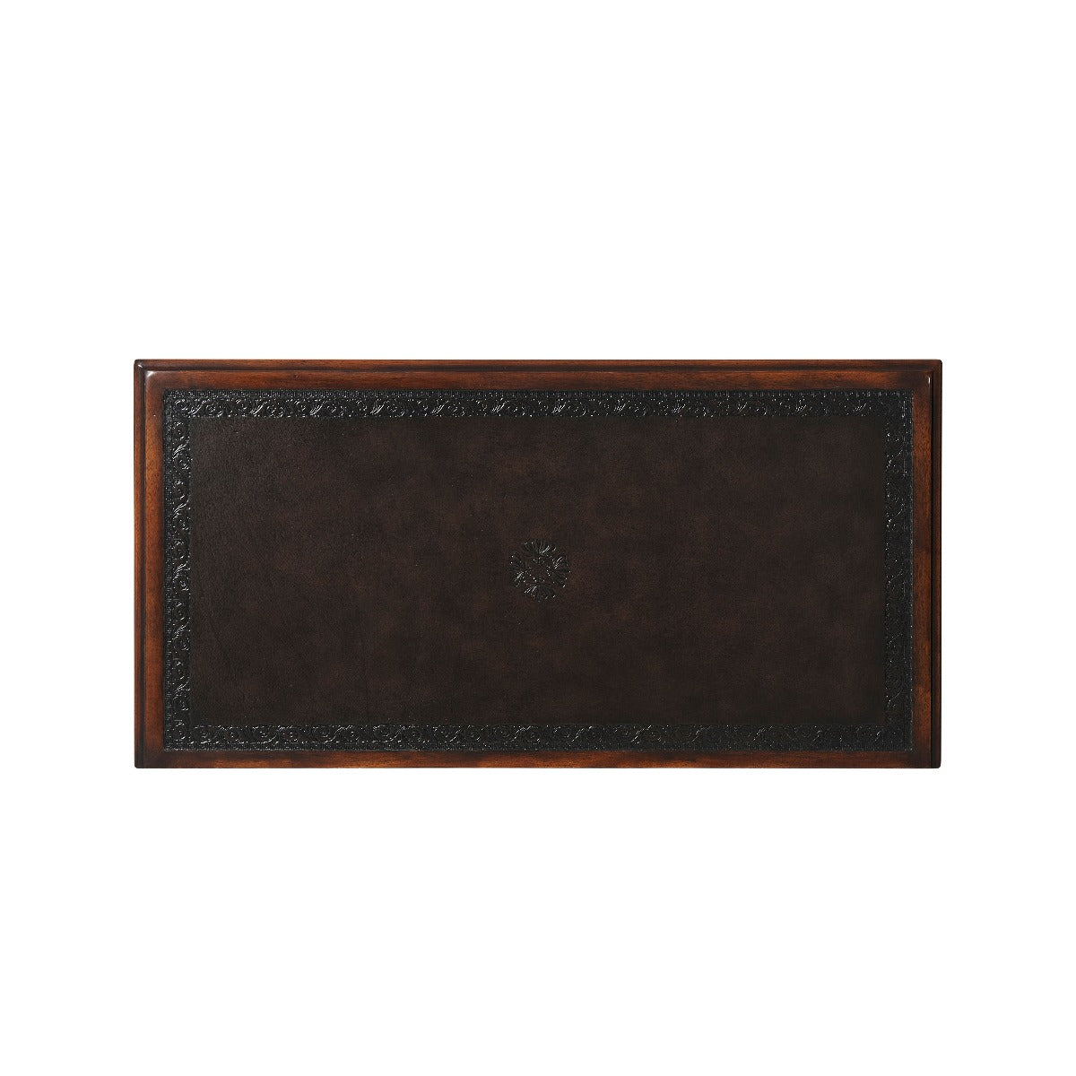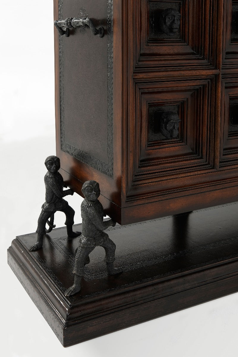 A leather panel chest on stand, with nine monkey head handled drawers, on four brass monkey supports and a leather plinth base. The original 19th century Italian.