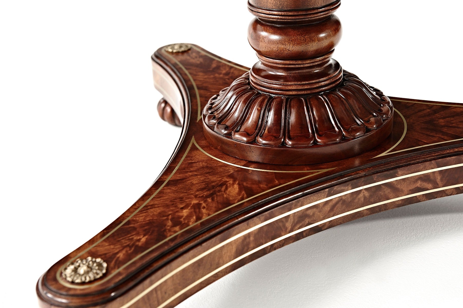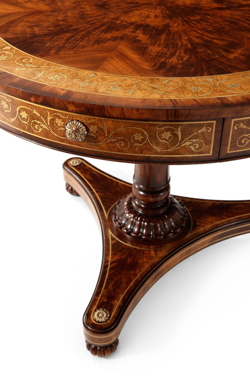 A flame veneered and mahogany, brass inlaid drum top centre table, the circular top inlaid with a band of scrolling leaves, the frieze fitted with a centre drawer, on a turned and tapering column with lapette carved base, on a concave sided brass strung plinth with rosette corners, on lobed bun feet.
