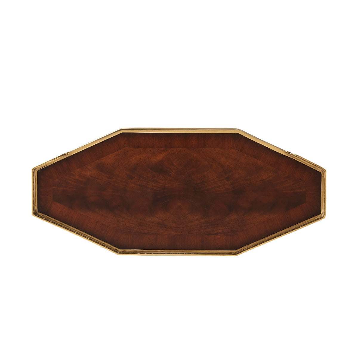 A solid oak and flame veneered three tier lamp table, each elongated octagonal tier with a three quarter pierced brass gallery, on shaped end supports with lozenge ornaments, terminating in splayed feet.
